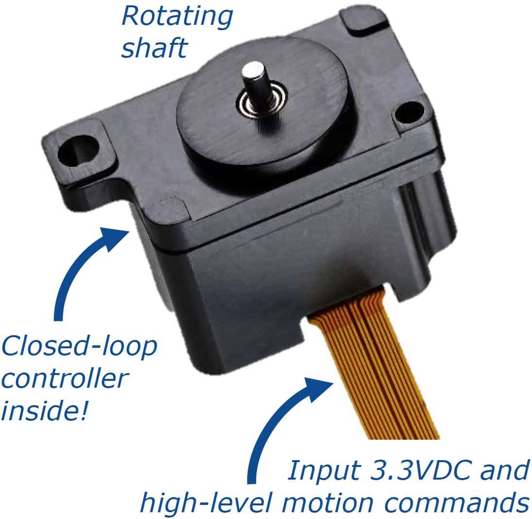 Der integrierte Controller ermöglicht außerdem eine schnelle und einfache Integration in Ihr System. Er akzeptiert die direkte Eingabe digitaler High-Level-Bewegungsbefehle von Ihrem Systemprozessor über UART, SPI, I2C oder eine analoge Servo-Schnittstelle. Gleichzeitig benötigt er nur 3,3 VDC und kann über USB oder Standardbatterien betrieben werden.