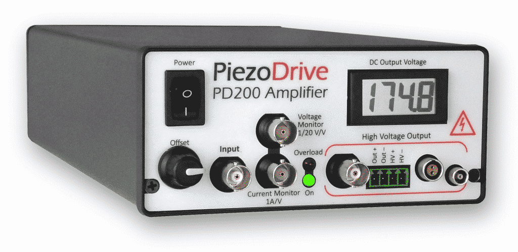 Der rauscharme PD200 Piezotreiberverstärker und Breitbandverstärker eignet sich hervorragend als Treiber für piezoelektrische Aktoren und ähnliche Lasten. Im Bereich von 50 bis 200 V kann die Ausgangsspannung unipolar, bipolar oder asymmetrisch ausgegeben werden. Bis zu ±200 V werden in Brückenkonfiguration erreicht. Der PD200 Piezoverstärker treibt alle Lastimpedanzen, auch unlimitiert kapazitive wie Piezostackaktoren, Standardpiezoaktoren, Zweidraht-Biegeaktoren und auch Dreidrahtbiegeaktoren mit zusätzlicher Bias-Spannung.