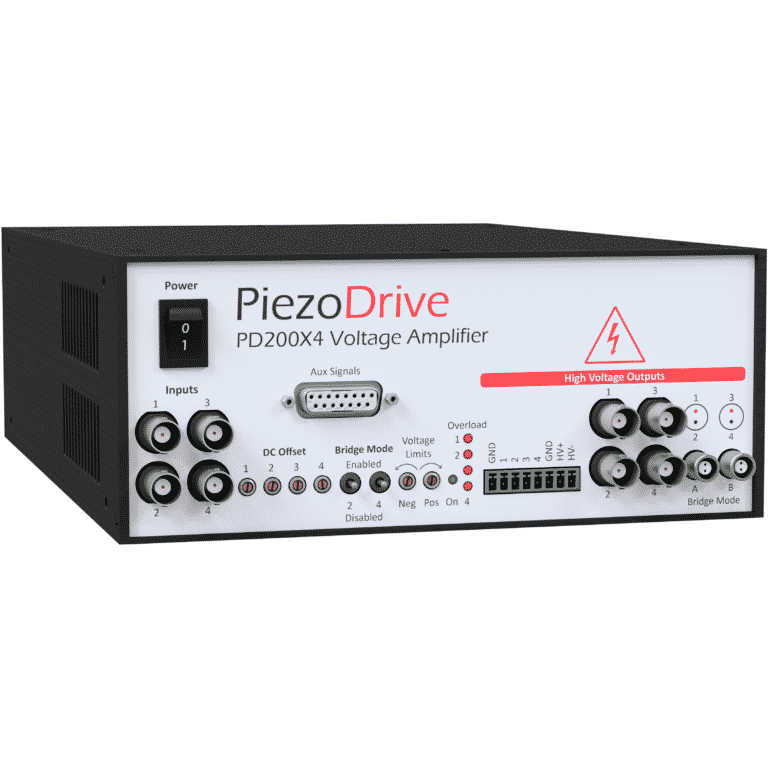 Der PD200X4 Piezotreiberverstärker von PiezoDrive verfügt über vier Kanäle zum Treiben von piezoelektrischen Aktoren oder ähnlichen Lasten. Dabei kann der Ausgangsspannungsbereich von 50 bis 200 V unipolar, bipolar oder asymmetrisch eingestellt werden. Bis zu ±200 V können mit zwei Kanälen und Verschaltung der Last als Brücke erreicht werden. Schalter auf der Vorderseite und dedizierte Buchsen für unabhängige sowie Lasten in Brückenschaltung machen es einfach, zwischen vier unabhängigen Kanälen und jeweils zwei Brückenkanälen bei doppeltem Ausgangsspannungsbereich umzuschalten.