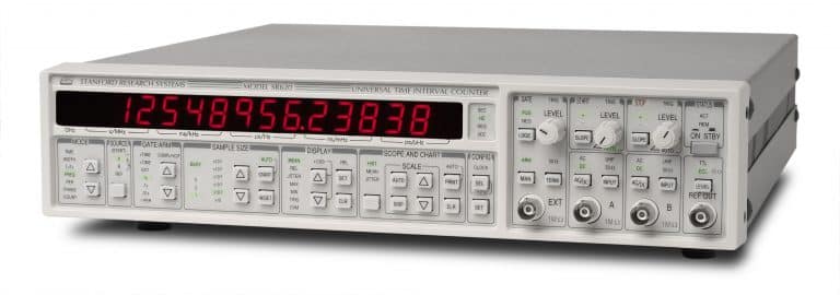 Die Firmware des SR620 Time Interval Counters stellt eine Vielzahl von statistischen Funktionen zur Verfügung. Hierzu gehören Mittel-, Maximal-, Minimalwert, Standardabweichung und Allanvarianzauswertung. Histo-gramm, Standardabweichung, Mittelwert und Allanvarianz können am X/Y-Scope, Plotter oder Printer grafisch dargestellt bzw. dokumentiert werden. Zwei Signaleingänge mit getrennt einstellbaren Triggerschwellen (10 mV Auflösung) ermöglichen Phasendifferenzmessungen mit bis zu 0,001 Grad Genauigkeit. DVM-Eingänge sorgen für Anzeigen bis 20 V.