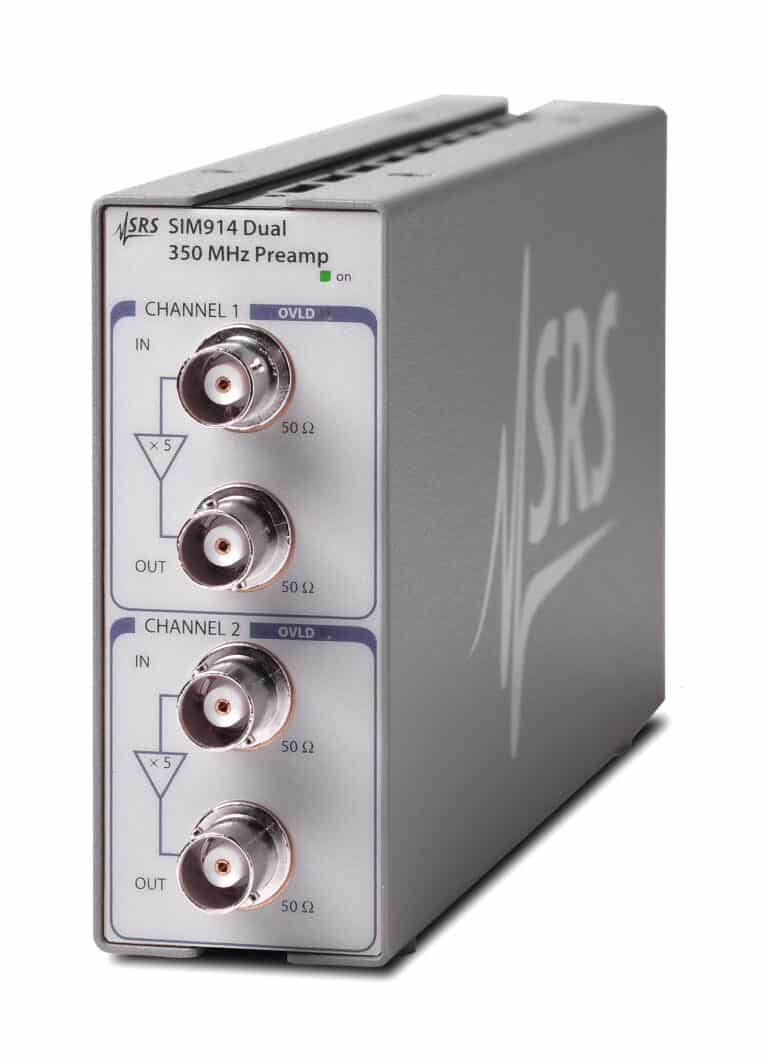 Das 350 MHz-Vorverstärkermodul SIM914 enthält zwei DC-gekoppelte Verstärker mit großer Bandbreite und einer Verstärkung von jeweils 5 (14 dB). Seine schnelle Anstiegszeit, sein geringes Rauschen und seine hervorragende Gleichstromgenauigkeit machen es ideal für die Verstärkung von Signalen wie denen von Fotovervielfacherröhren und Fotodioden. Die Verstärkungsstufen mehrerer SIM914 können ohne Schwingungsprobleme kaskadiert werden. Die Eingangsbuchsen benötigen lediglich eine Erholungszeit von 3 ns nach einer 10-fachen Überlastung. Die große Bandbreite sorgt zusammen mit einer Eingangs- und Ausgangsimpedanz von 50 Ω für eine lineare Phasenantwort über den gesamten Frequenzbereich, wobei Impulsformen erhalten bleiben.