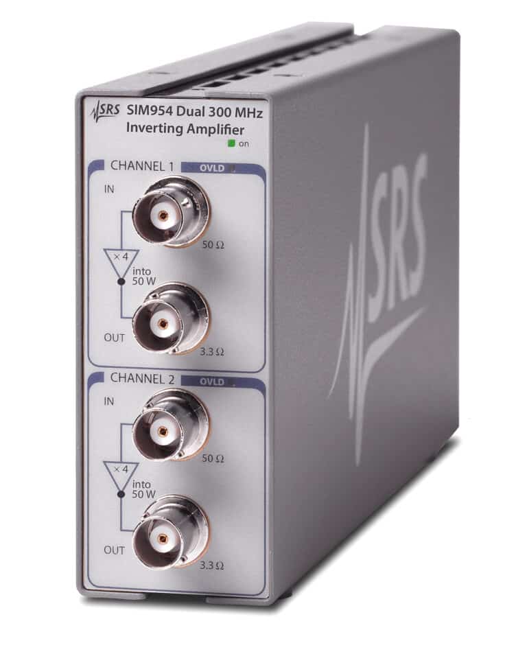 Das SIM954-Verstärkermodul verfügt über zwei invertierende 300-MHz-Verstärkerkanäle, die jeweils eine Ausgangsspannung von bis zu ±10 V und einen Ausgangsstrom von bis zu 1 A liefern. Der Verstärker kann verwendet werden, um viele Arten von geringen Laborlasten (einschließlich induktiver und kapazitiver Lasten) zu speisen, um die Einschränkungen und hohen Kosten typischer HF-Leistungsverstärker zu vermeiden.