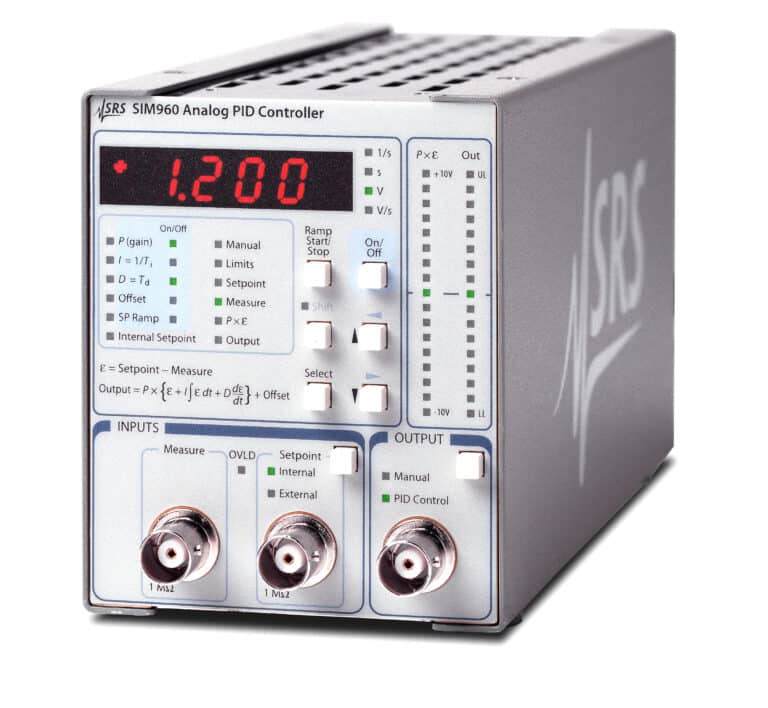 Das analoge PID-Regler-Modul SIM960 ist ein einzigartiges Messgerät für die anspruchsvollsten Steuerungsanwendungen. Es kombiniert analoges Signalhandling mit digitaler Steuerung und bietet Ihnen das Beste aus beiden Welten. Regelkreise mit hoher Bandbreite (100 kHz) können ohne diskrete Zeit- oder Quantisierungsartefakte implementiert werden.