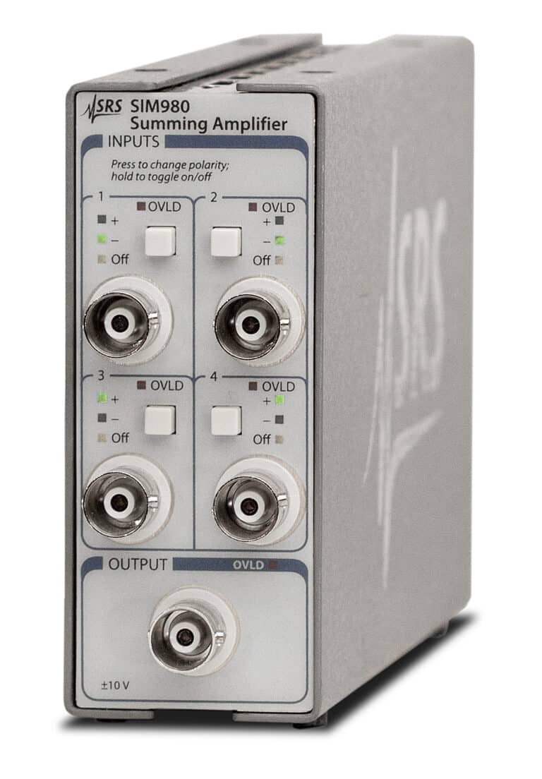 Das Summierverstärkermodul SIM980 verfügt über vier Eingangskanäle, die addiert oder voneinander subtrahiert werden können. Das Ausgangsrauschen beträgt weniger als 60 nV/√Hz und das Übersprechen zwischen den Kanälen weniger als -80 dB. Mit einer Bandbreite von 1 MHz bei einer Anstiegsrate (Slew Rate) von 40 V/ms und Eingangsoffsets, die auf ±100 µV getrimmt sind, ist der SIM980 in vielen analogen Anwendungen äußerst nützlich.