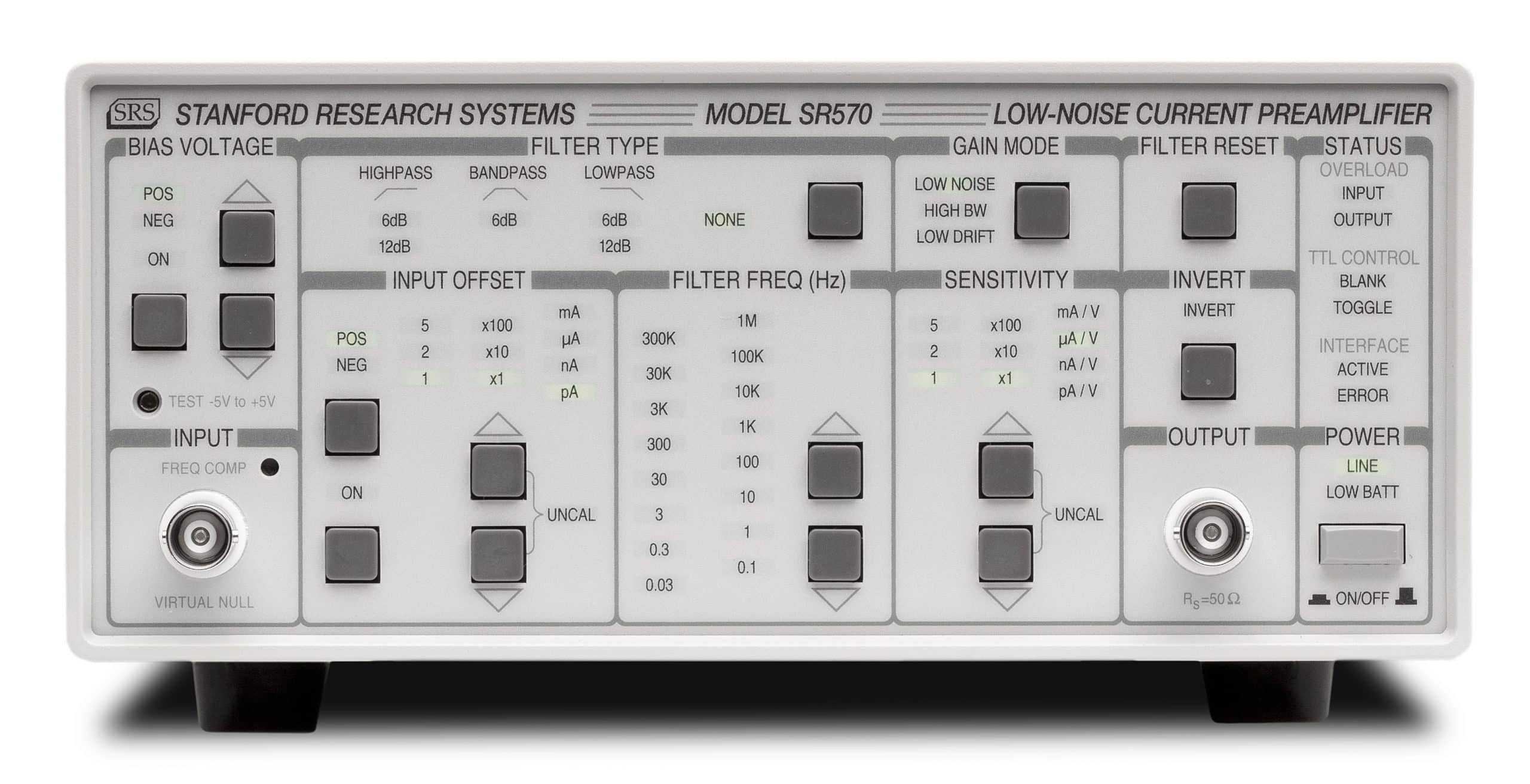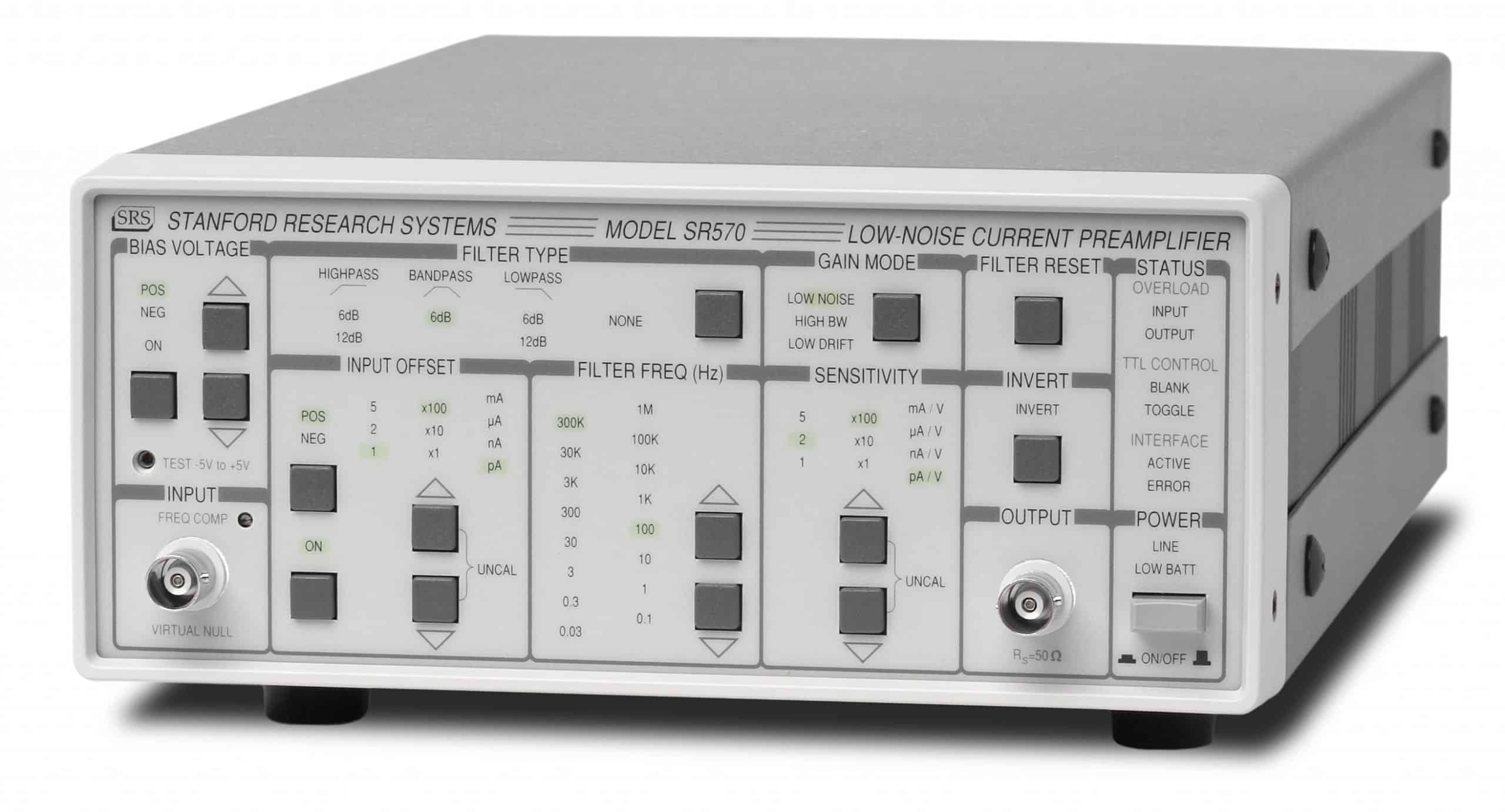 Seine Kennzeichen sind geringes Rauschen, hohe Verstärkung und große Bandbreite bei niedriger Drift. Das Gerät findet seine Anwendungen im weiten Feld der Analysen-, Sensor- und Detektortechnik. Der SR570 bietet Empfindlichkeiten von 1 pA/V bis 1 mA/V in Schritten von 1, 2 und 5 an. Um ungewünschte Frequenzüberlagerungen und Rauschleistung im Nutzbereich zu minimieren, sind zwei frei konfigurierbare Filter als Tief-, Hoch- oder Bandpaß im Signalweg einfügbar.
