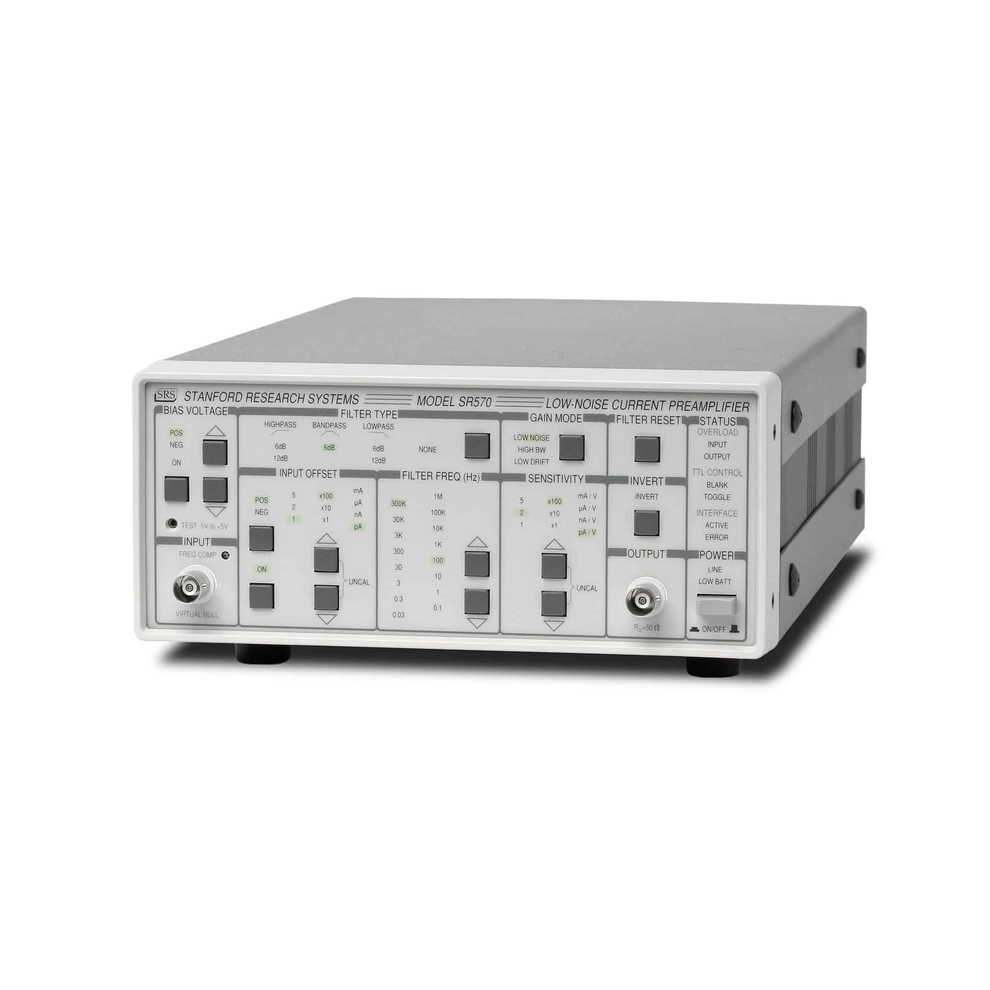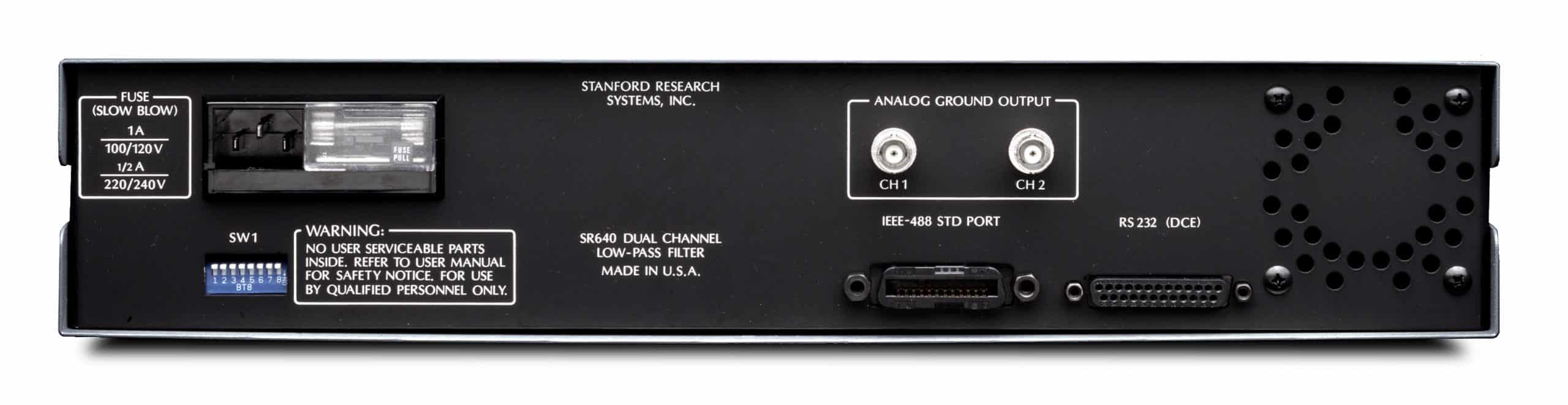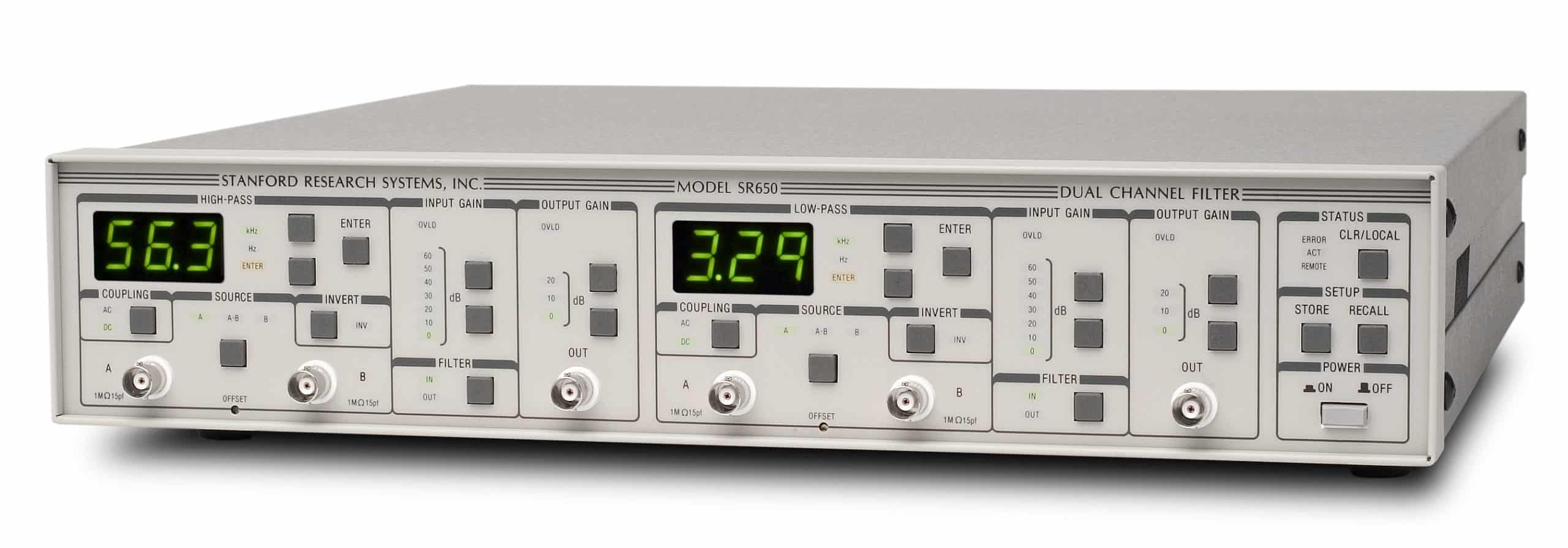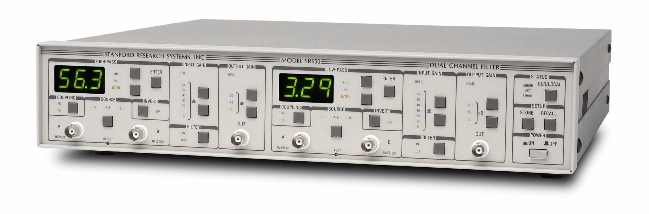 Die Filtervorverstärker SR640 (2x Tiefpass), SR645 (2x Hochpass) und SR650 (1x Tiefpass und 1 x Hochpass) können als steilflankige Signalfilter eingesetzt werden. Modell SR650 ermöglicht durch Hintereinanderschaltung von Hoch- und Tiefpass einen Bandpass zu realisieren. Vor und nach dem Filter, mit einer Sperrbereichsdämpfung von 80 dB, sind zwei rauscharme Verstärker mit einstellbaren Verstärkungsfaktoren von max. 60 dB und 20 dB eingebaut. Wird das Filter nicht benötigt kann es durch eine Bypass-Schaltung umgangen werden.Über die standardmäßig eingebauten IEEE488- und RS232-Schnittstellen sind alle Einstellungen vom PC aus programmierbar.