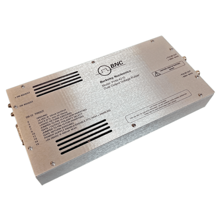 Die Ausgänge können auch invertiert werden, um vom Hochspannungspotential zur Masse zu pulseen. Breite und Frequenz der Ausgangspulse folgen der Breite und Frequenz des TTL-Eingangsports. Die Amplituden der Ausgangsspannung jedes Kanals sind unabhängig voneinander mittels Schraubendreher von 0 bis 950 V einstellbar. Die Potentiometer sind leicht zugänglich auf der Rückseite des Moduls angebracht.
