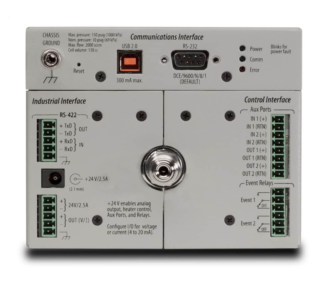 Um die spezifizierte Genauigkeit von 0,1 % ohne weitere spezielle Vorortkalibrierung des binären Gasanalysators zu erreichen, muss der Gasdruck auf ± 1 psi (6,9 kPa) genau bekannt sein. Wenn der Druck bekannt und relativ stabil ist, kann dieser über das Frontpanel oder über eine der Schnittstellen eingestellt werden. Bei vielen Anwendungen kann der Druck jedoch mit der Zeit oder den Betriebsbedingungen variieren. Wenn das der Fall ist, profitiert die Messung von der Integration eines Druckwandlers zusammen mit dem BGA244 unter Verwendung eines der analogen Eingänge. Somit wird eine einfache, integrierte Lösung bereitgestellt, die bestmögliche Genauigkeit über eine Reihe von Betriebsbedingungen hinweg gewährleistet.