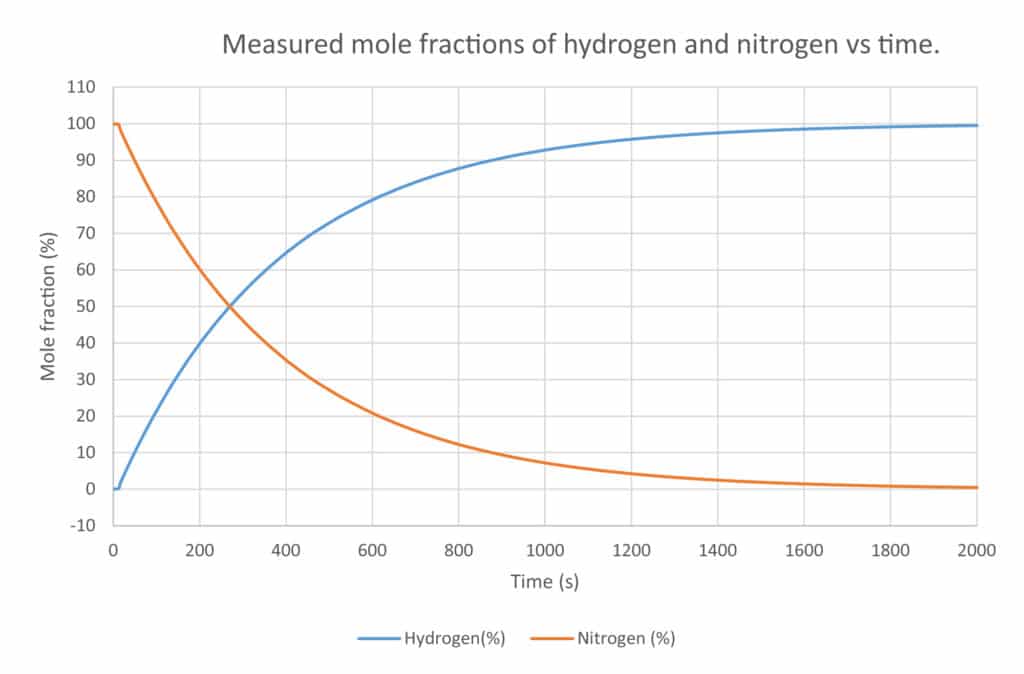 Eine einfache Anordnung wurde verwendet, um den Analysator über eine breite Palette von Mischungen zu testen: Der akustische Hohlraum mit 130 cm³ Volumen wurde mit reinem Stickstoff befüllt und anschließend mit der Datenaufzeichnung begonnen. Nach 10 Sekunden wurde ein Fluss von 20 sccm Wasserstoff gestartet. Um einen Rückfluss zu verhindern, wurde der Hohlraum durch ein dünnes Rohr mit 14,7 psi(a) (1013 hPa) in den Raum entlüftet. Der Wasserstoffstrom spülte Stickstoff aus der Zelle und konvergierte exponentiell zu reinem Wasserstoff mit einer Zeitkonstante von 130 cc/20 sccm = 6,5 Minuten. Die gemessenen Daten sind in Abb. 5 dargestellt.