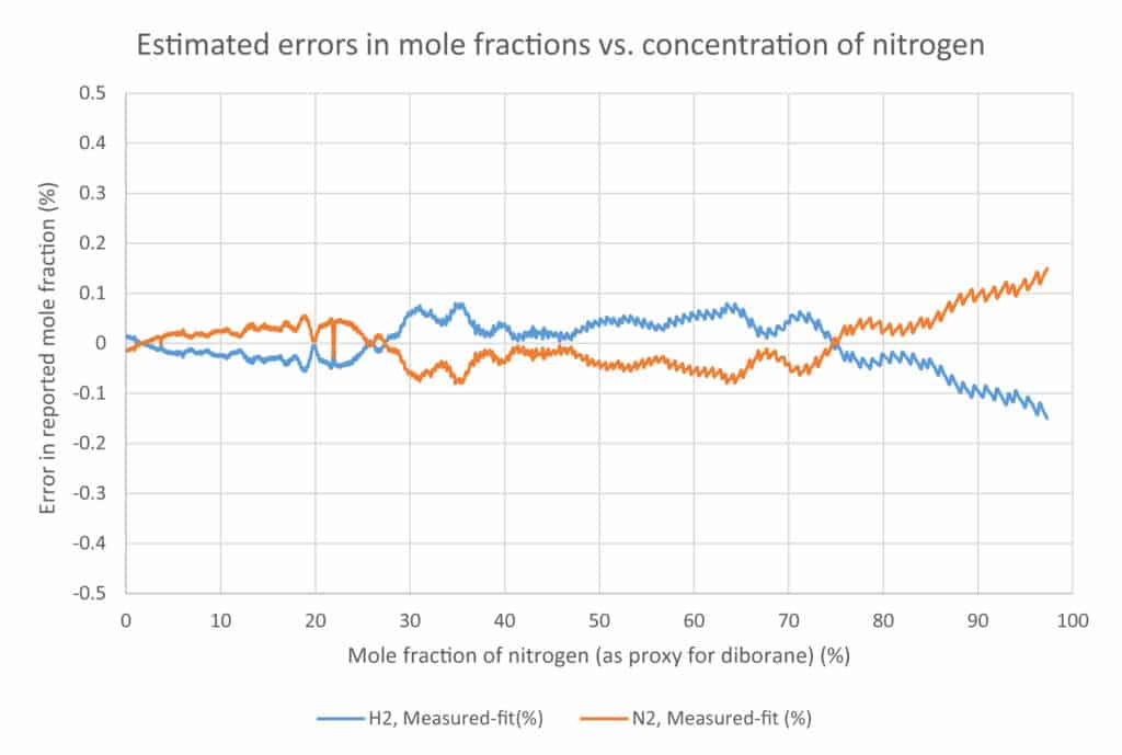 Das geschätzte Mittel des Fehlers (RMS) bei der Konzentrationsmessung von Stickstoff (oder Diboran) in Wasserstoff beträgt somit etwa 0,036 % über den gesamten Bereich. Der Fehler des Molaren Stoffanteils beträgt außerdem weniger als 0,05 % für Konzentrationen unter 20 %. Beim verwendeten Gasanalysator ist der Fehler bei niedrigen Stickstoffkonzentrationen am kleinsten. Ein Anwender kann den Fehler jedoch entweder bei 0 % oder 100 % Konzentration nullen, indem er die „Rel“-Funktion des Geräts verwendet und es somit individuell auf die Bedürfnisse anpasst. [5]