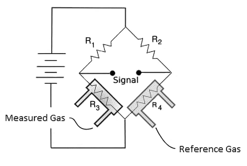 Konventionelle binäre Gasanalysatoren, die auf der Messung thermischer Leitfähigkeit (TC von Thermal Conductivity) basieren, quantifizieren die Fähigkeit des Gasgemisches, Wärme zu leiten. Zwei elektrisch beheizte Filamente (oder Thermistoren) werden sowohl im zu messenden Gasgemisch als auch in einem separaten Referenzgas platziert. Die von jedem Gas abgeführte Wärme kühlt das entsprechende Filament und verändert somit seinen elektrischen Widerstand. Die Widerstandsdifferenz zwischen beiden Filamenten ergibt ein relatives Maß für die Wärmeleitfähigkeit der Gase.