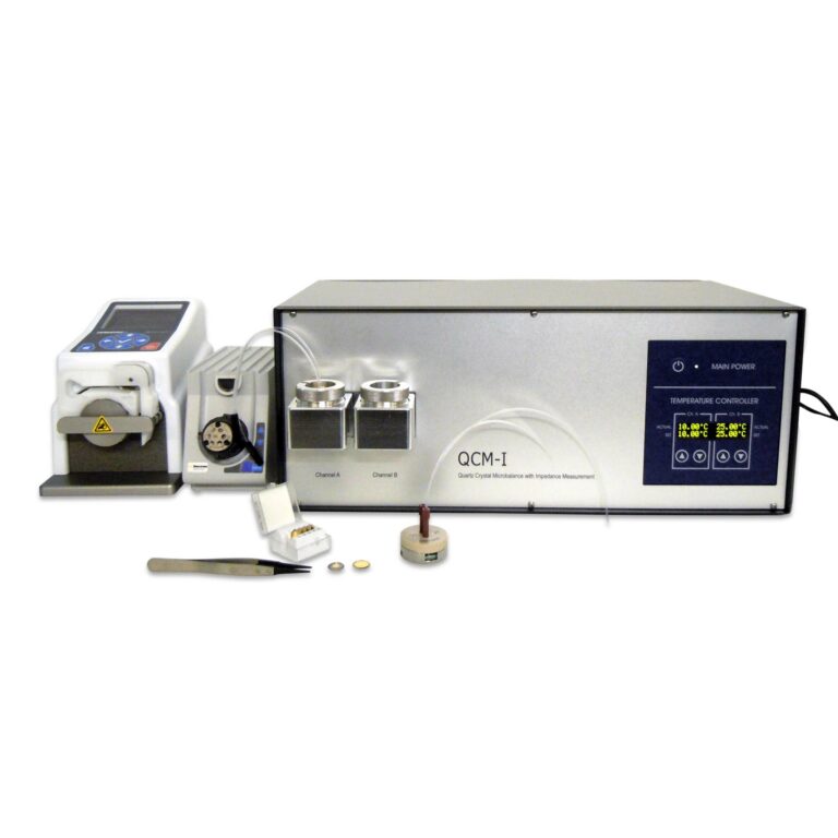 Die Quarzkristall-Mikrowaage misst sowohl Frequenzänderungen als auch Dissipation eines Quarzkristallresonators oder eines adsorbierten Films. Das QCM-System fungiert als hochempfindlicher Massesensor und ist nützlich für eine Vielzahl von Anwendungen wie z. B. Biosensoren, chemische Sensoren, Korrosion, Polymerfilme, Nanopartikelfilme, Proteinfilme, Biofilme usw. Frequenz- und Dissipationsänderungen erlauben Rückschlüsse auf Änderungen in Masse, Viskosität und Elastizität von Filmen. Das Messprinzip basiert auf einer Impedanzanalyse des Quarzkristalls. Dabei werden die Resonanzfrequenz und Bandbreite der Resonanzleitwertkurve bestimmt. Die Bandbreite oder volle Breite bei halbem Maximum (FWHM) steht in direkter Korrelation mit dem Qualitätsfaktor (Q), der per Definition der Kehrwert der Dissipation (D) ist.