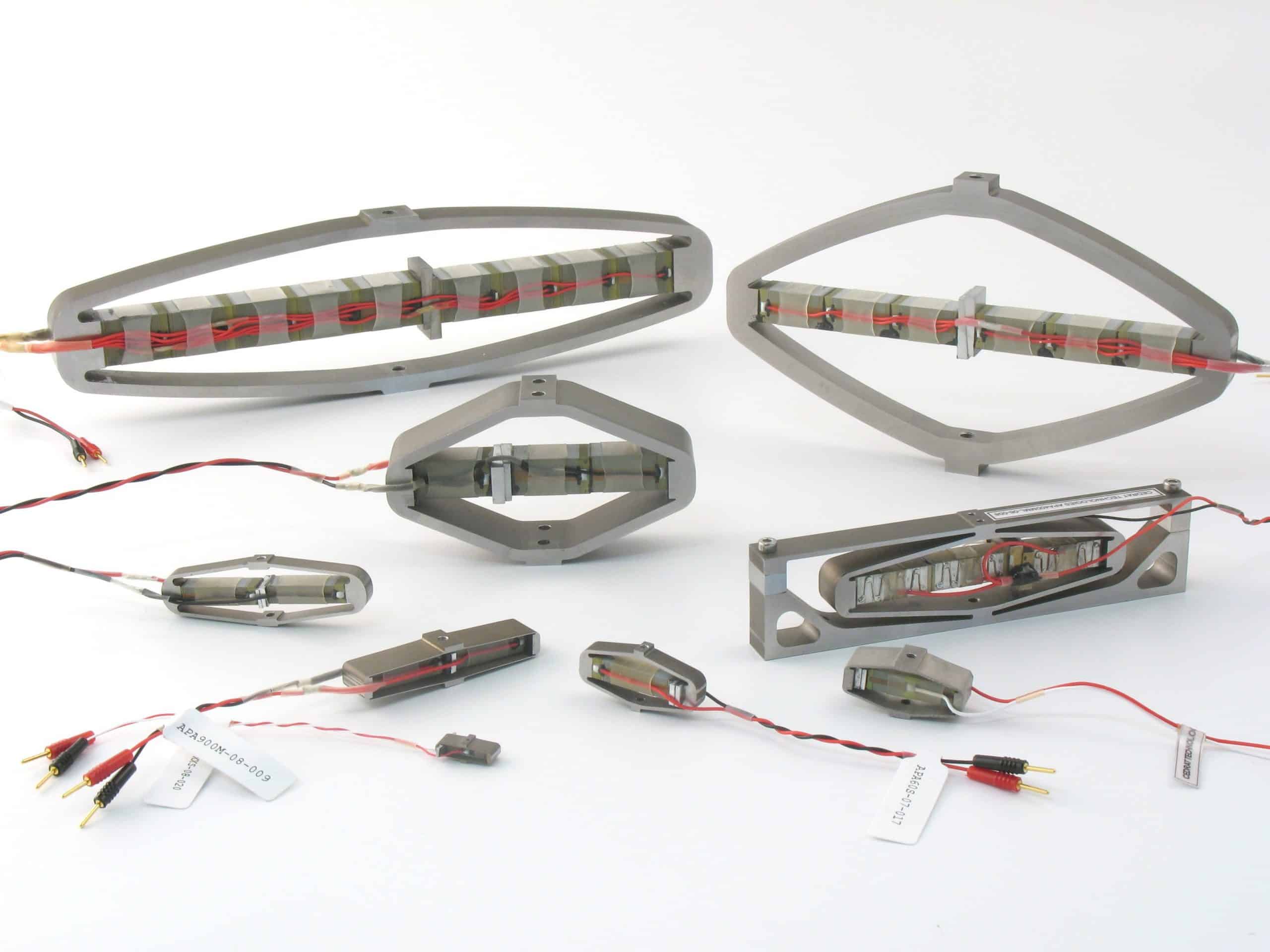 Der von CEDRAT TECHNOLOGIES patentierte verstärkte piezoelektrische Stellantrieb besteht aus einem mechanisch verstärkenden vorgespannten Stapel aus piezoelektrischer Niederspannungskeramik (MLA). Die mechanische Verstärkung wird anhand einer externen Ellipsenschale aus rostfreiem Stahl erzielt, die sich entlang der kurzen Achse die MLA-Verformung, die entlang der Hauptachse auftritt, verstärkt. Dieser elliptische Rahmen schützt auch die MLA vor Zugkraft. Mechanische Schnittstellen erleichtern dem Benutzer den Einbau. Der Spannrahmen legt die optimale Vorbelastungskraft an die MLAs an, dass bei dynamischer Belastung längere Lebensdauer und bessere Performance als mit herkömmlichen mechanischen Verstärkern, die auf dem Hebelarm- oder Biegedrehpunktsystem basieren, möglich ist.