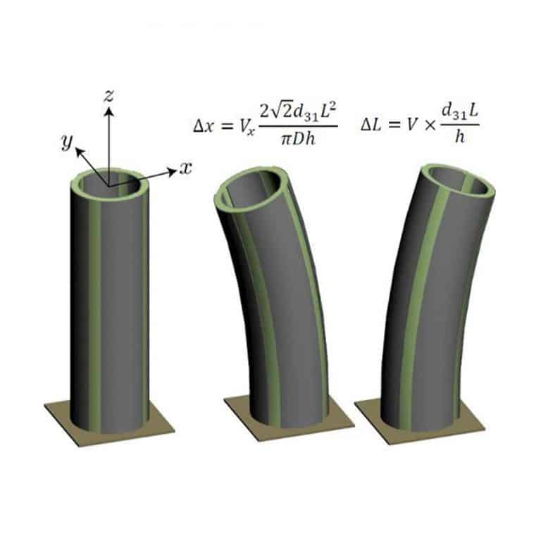 Die Rohrscanner der TB-Serie von PiezoDrive bestehen aus dünnen Zylindern aus radial polarisiertem piezoelektrischen Material, vier äußeren Elektroden und einer durchgehenden inneren Elektrode. Sobald eine Spannung an eine der vier äußeren Elektroden angelegt wird, dehnt sich der Aktor, das eine vertikale Kontraktion zur Folge hat und eine große laterale Auslenkung der Röhrenspitze. Eine Elektrode um den gesamten Umfang kann für radiale Erweiterung oder Kontraktion verwendet werden.