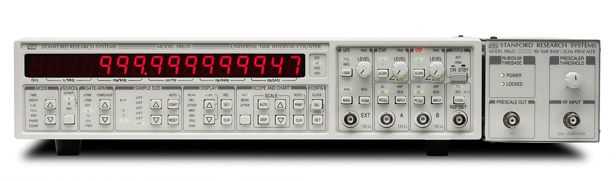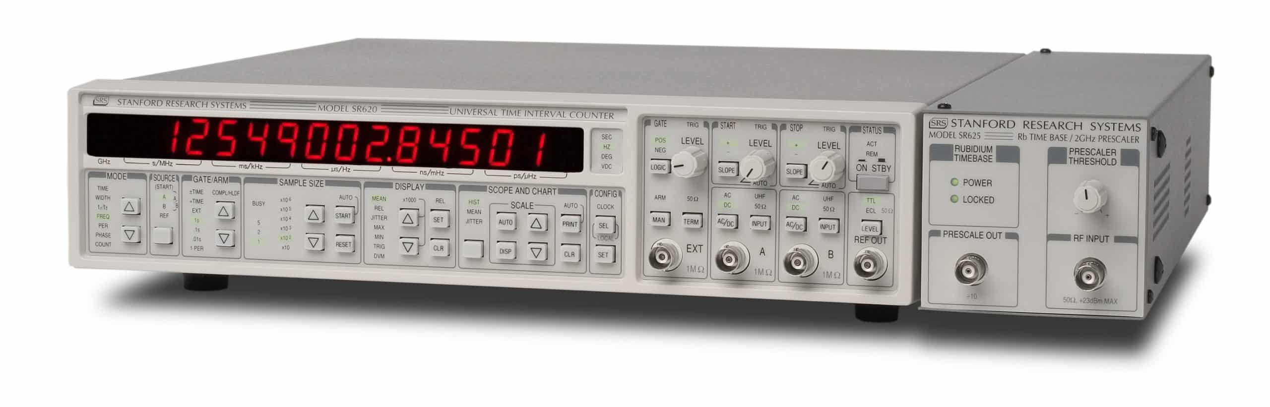Mit dem SR625 ist ein hochgenauer Multifunktionszähler auf dem Markt. Applikationen sind Kalibrierung von Bodenstationen, Über-tragern und anderen Kommunikationssystemen. Das Gerät hat die Genauigkeit einer Rubidium-Zeitbasis. Die Firmware des SR625 Time Interval Counters stellt eine Vielzahl von statistischen Funktionen zur Verfügung. Hierzu gehören Mittelwert, Maximalwert, Minimalwert, Standardabweichung und Allanvarianzauswertung. Histogramm, Standardabweichung, Mittelwert und Allanvarianz können am X/Y-Scope, Plotter oder Printer grafisch dargestellt, bzw. dokumentiert werden.