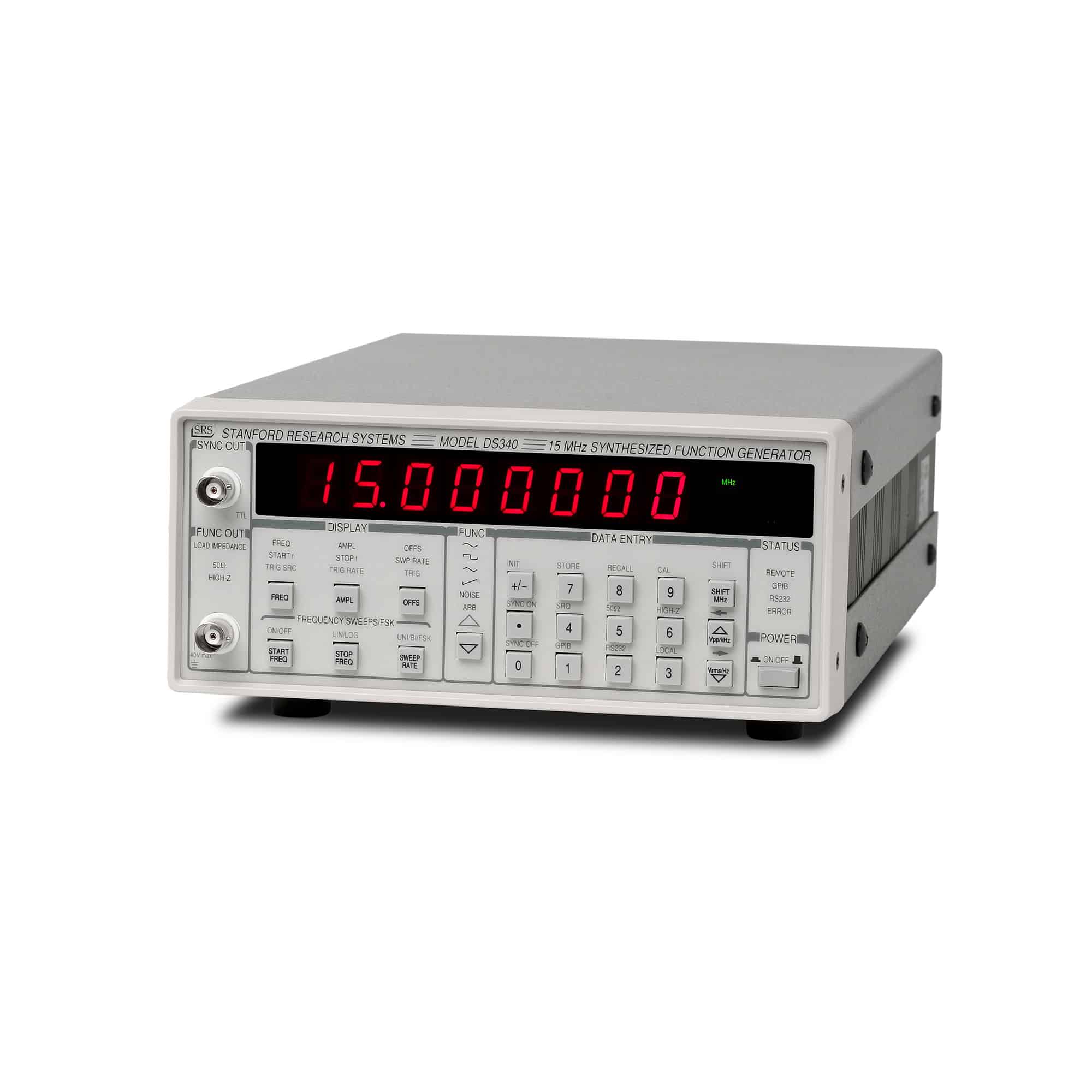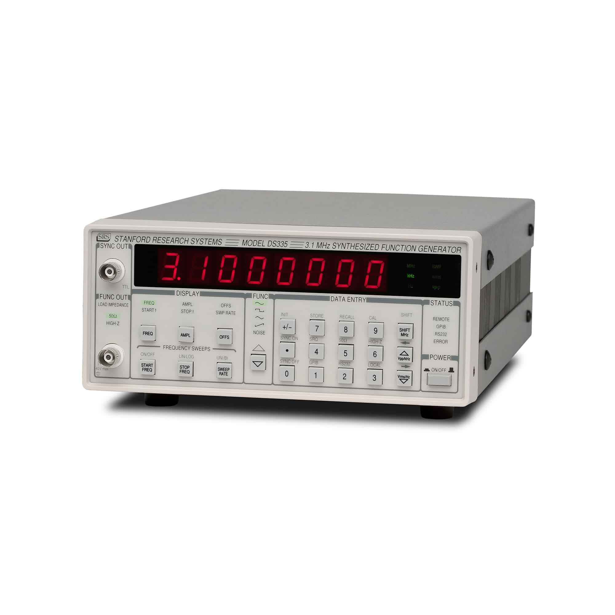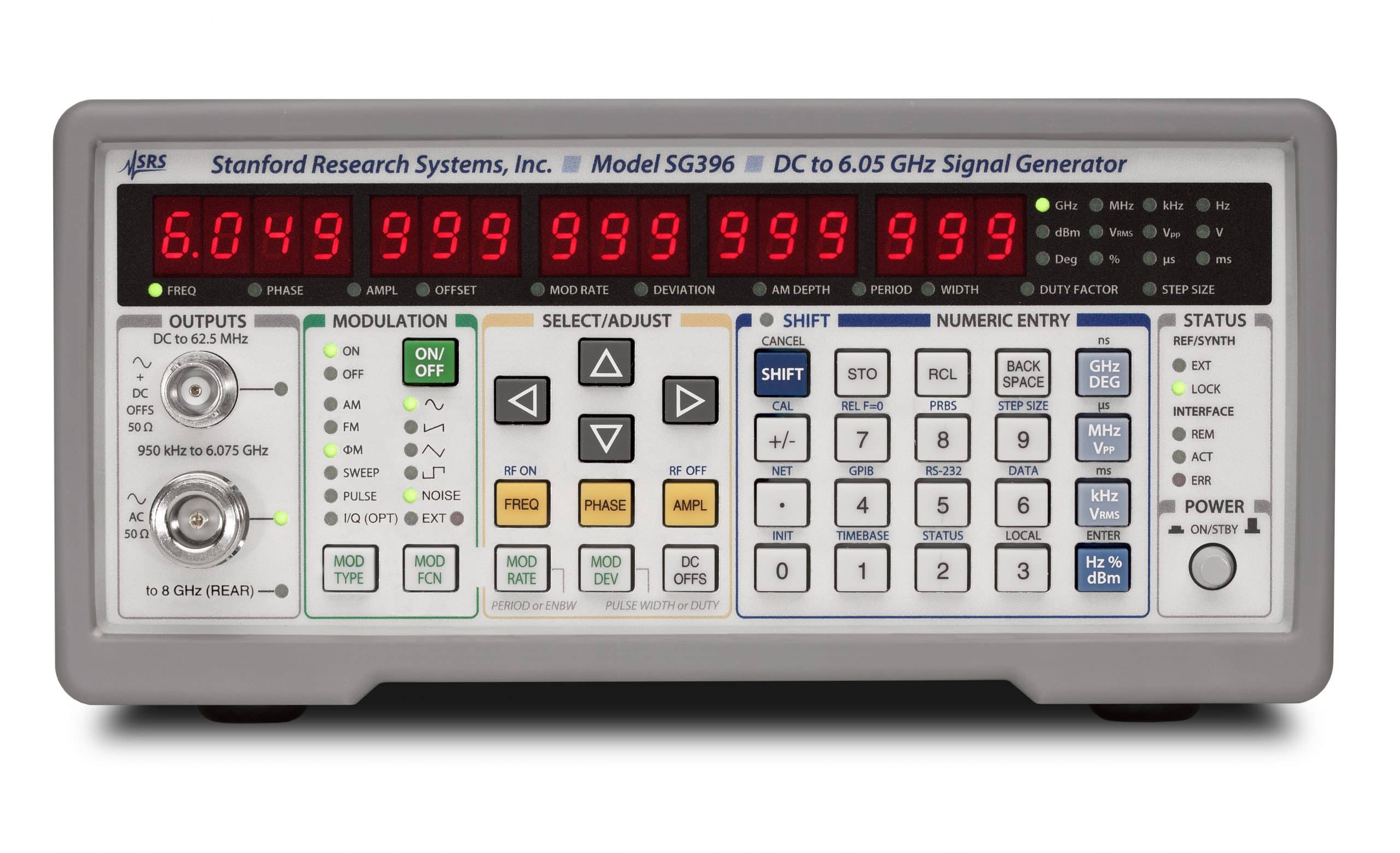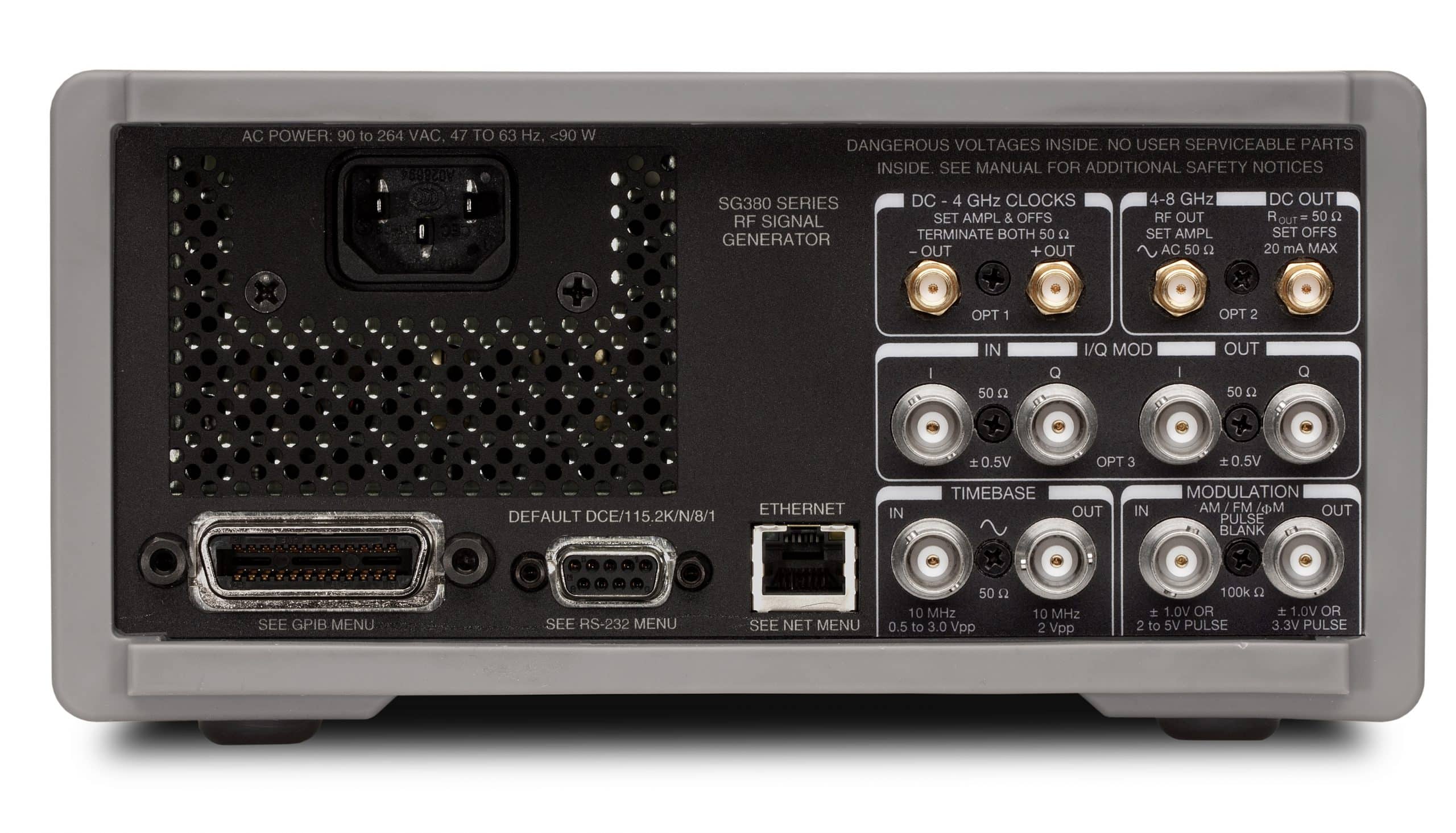 Die Synthesizersignalgeneratorenfamilie SG38x (SG380-Serie) besteht aus 3 HF-Signalgeneratoren mit herausragenden Eigenschaften. Als Modulationsquellen dienen Rechteck-, Sinus-, Sägezahn-, Puls- und Rauschsignale. Optional sind differentielle Taktausgänge mit PECL-, ECL-, LVDS-, CML- und NIM-Pegel erhältlich. Die standardmäßige Zeitbasis hat eine Genauigkeit von 0,002 ppm. Das Gerät verfügt über Ethernet-, GPIB- und RS232-Schnittstellen.