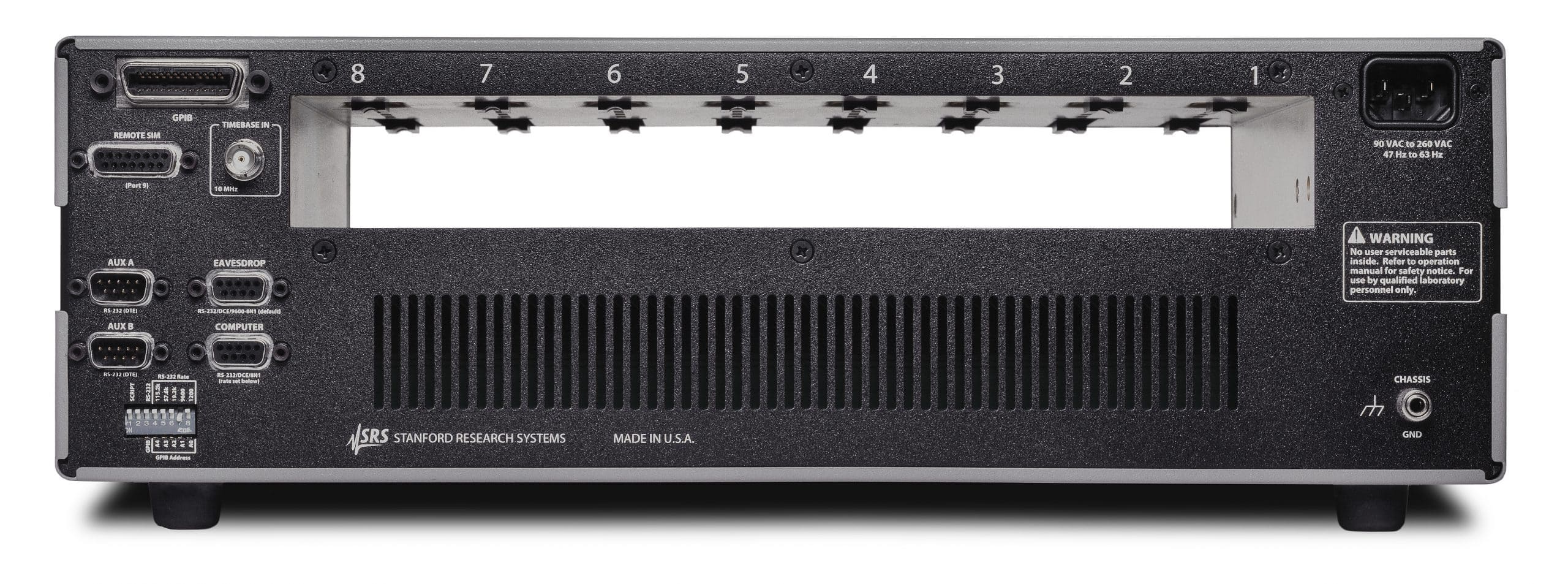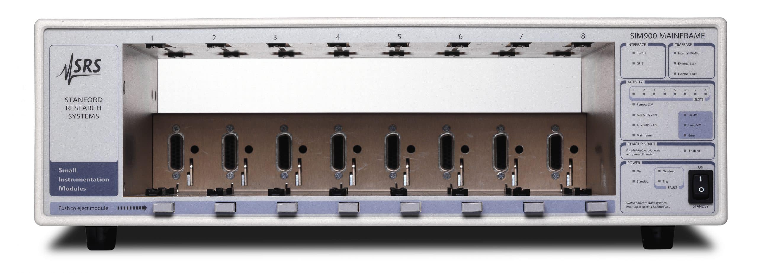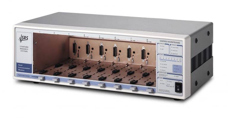 Der SIM900 Mainframe ist eine robuste, flexible Plattform für bis zu 8 wählbare Instrumente der SIM-Baureihe. Im Gegensatz zu herkömmlichen Einschubsystemen ist sowohl ein manueller Frontplatten- als auch ein computergestützter Betrieb möglich. Der Rahmen liefert die gesamte Spannungsversorgung, die Computerschnittstellen, die Taktsynchronisation und eine Anzeige über den individuellen Modulstatus.