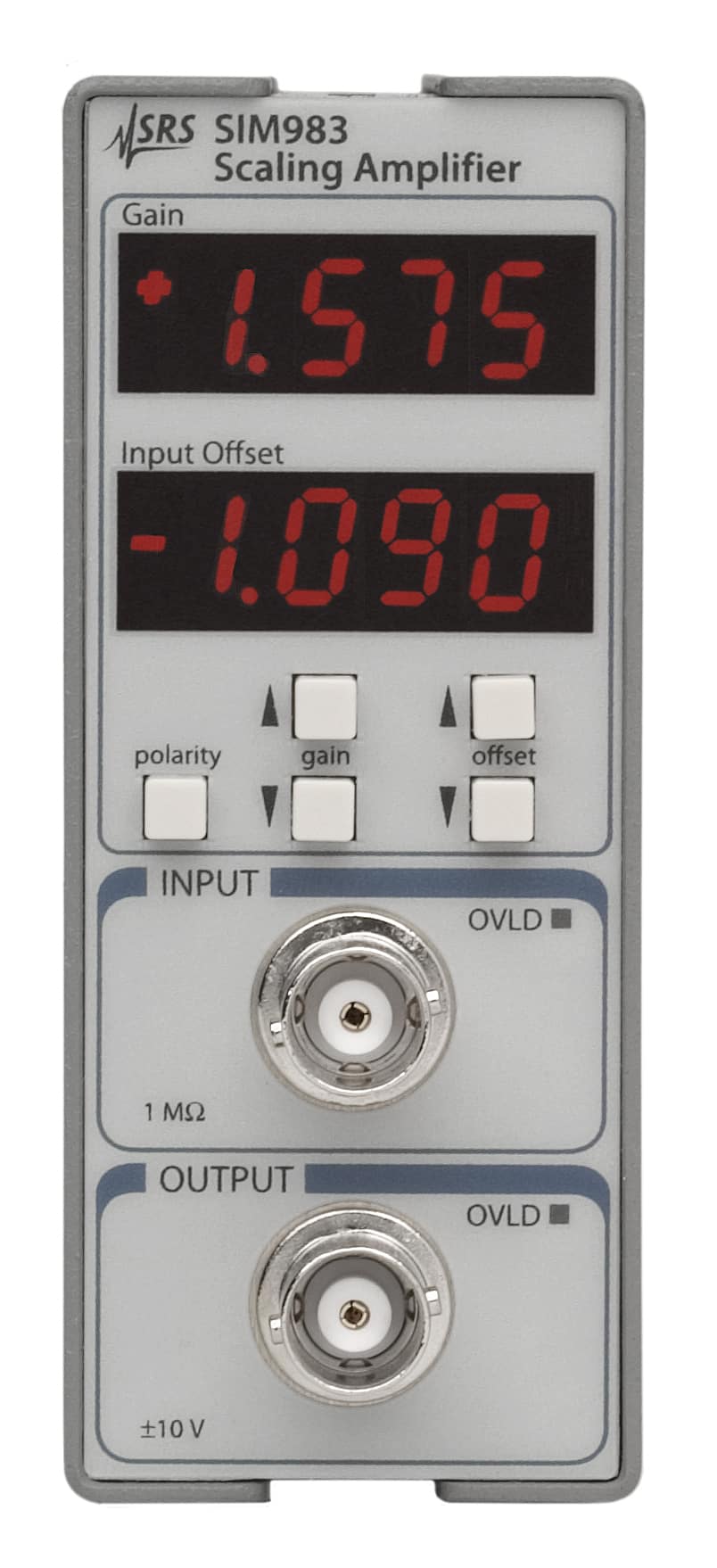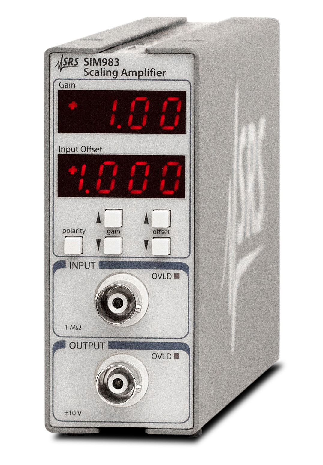 Das Skalierverstärkermodul SIM983 bietet eine fein einstellbare Verstärkungs- und Offset-Steuerung für analoge Signale. Sowohl Verstärkung als auch Offset werden mit einer Auflösung von 3½ Digits eingestellt, wobei der Signalpfad eine Bandbreite von mehr als 1 MHz hat. Das geringe Rauschen, die hohe Verstärkung und die hohe Anstiegsgeschwindigkeit machen das SIM983 zu einem sehr praktischen Werkzeug für die anspruchsvolle analoge Signalkonditionierung.