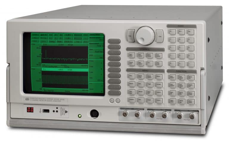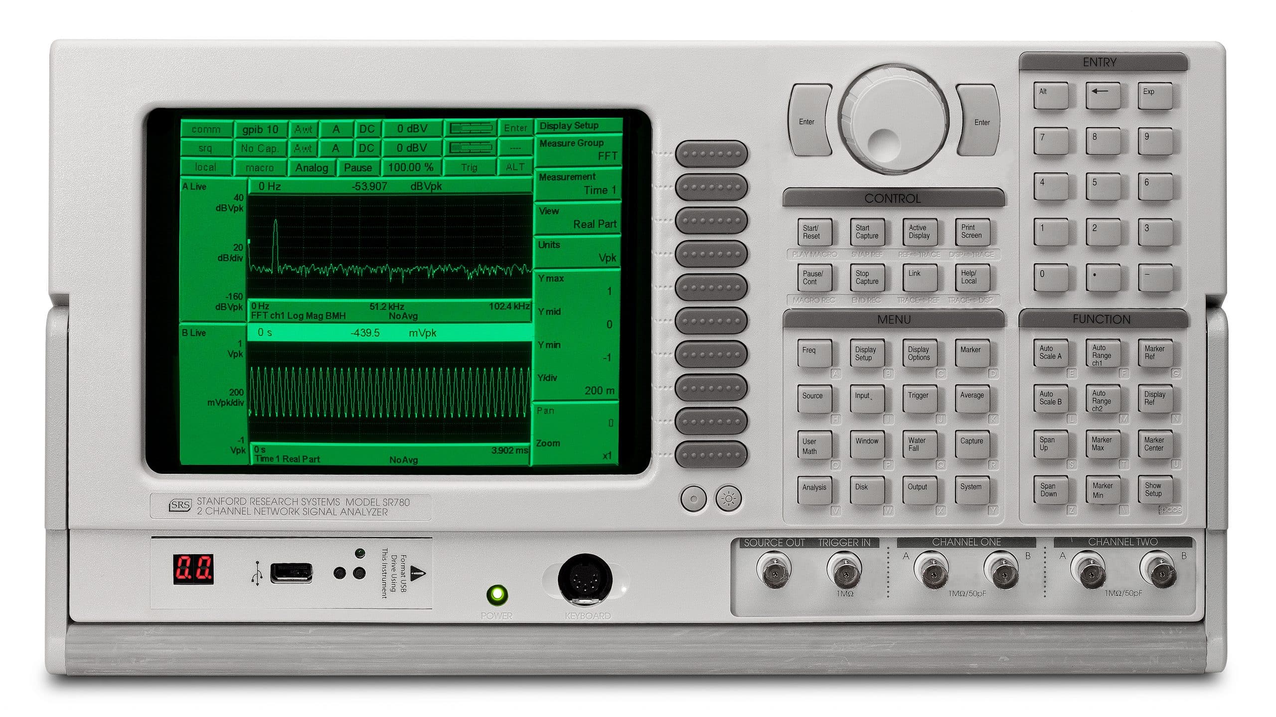 Die Anwendungsgebiete des SR780 erstrecken sich von der mechanischen Schwingungsanalyse über Audio- und Akustik-FuE bis hin zu Rauschmessungen und Filterdesign. Der SR780 ist ein leistungsorientierter Zweikanalnetzwerk-analysator mit einer Echtzeitbandbreite von 102,4 kHz. Das Gerät erlaubt neben der FFT noch Swept-Sine-Betriebsarten und Oktavanalysen. 8 MS Speicher für die Aufnahme von Transienten sind erhältlich. Die Bedienung ist zur schnellen und fehlerfreien Einstellung menügeführt und beinhaltet eine On-Screen-Hilfefunktion. Durch die eingebaute Signalquelle sind Bodediagramme nach Betrag und Phase, sowie Intermodulationsmessungen möglich.