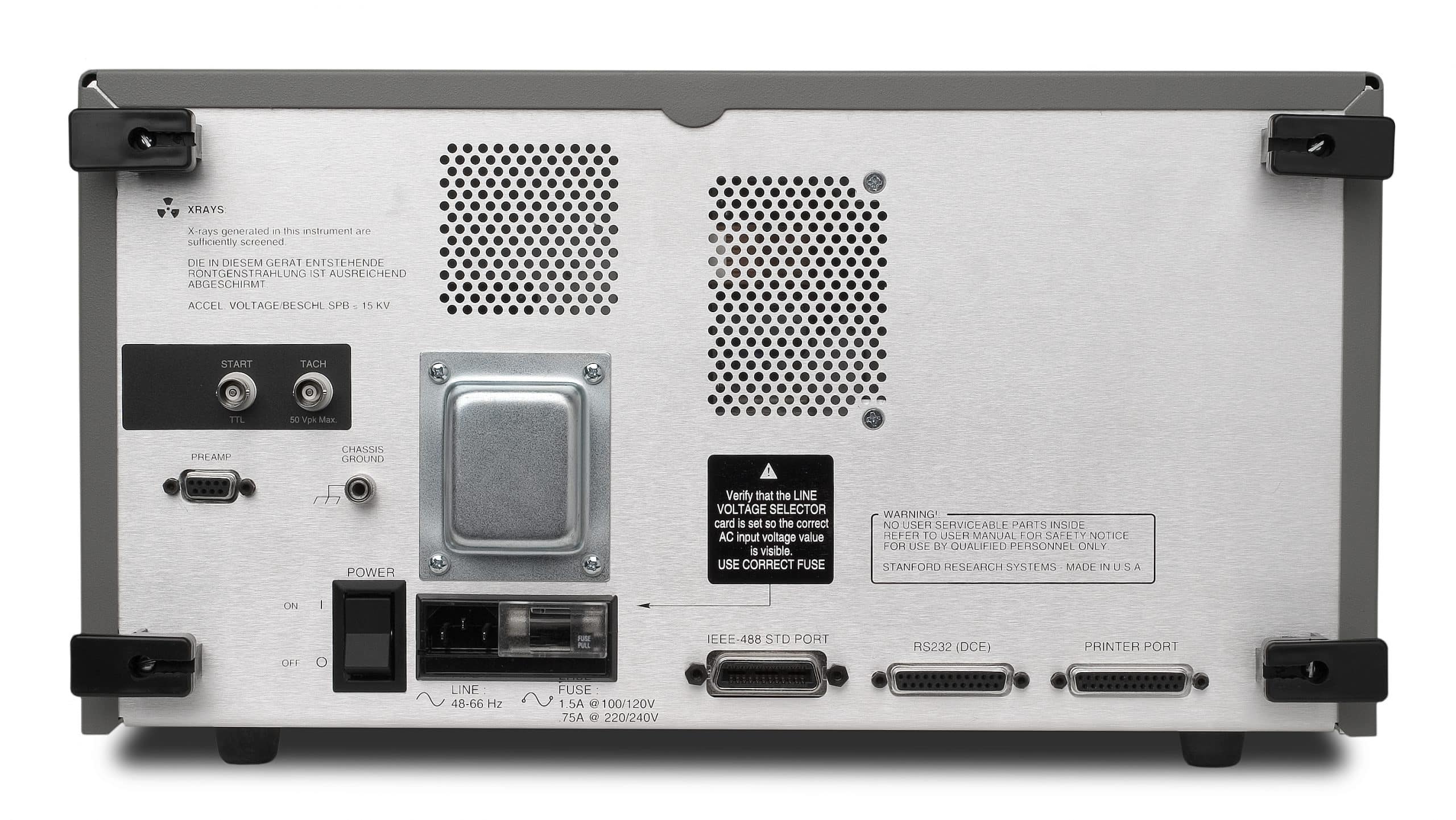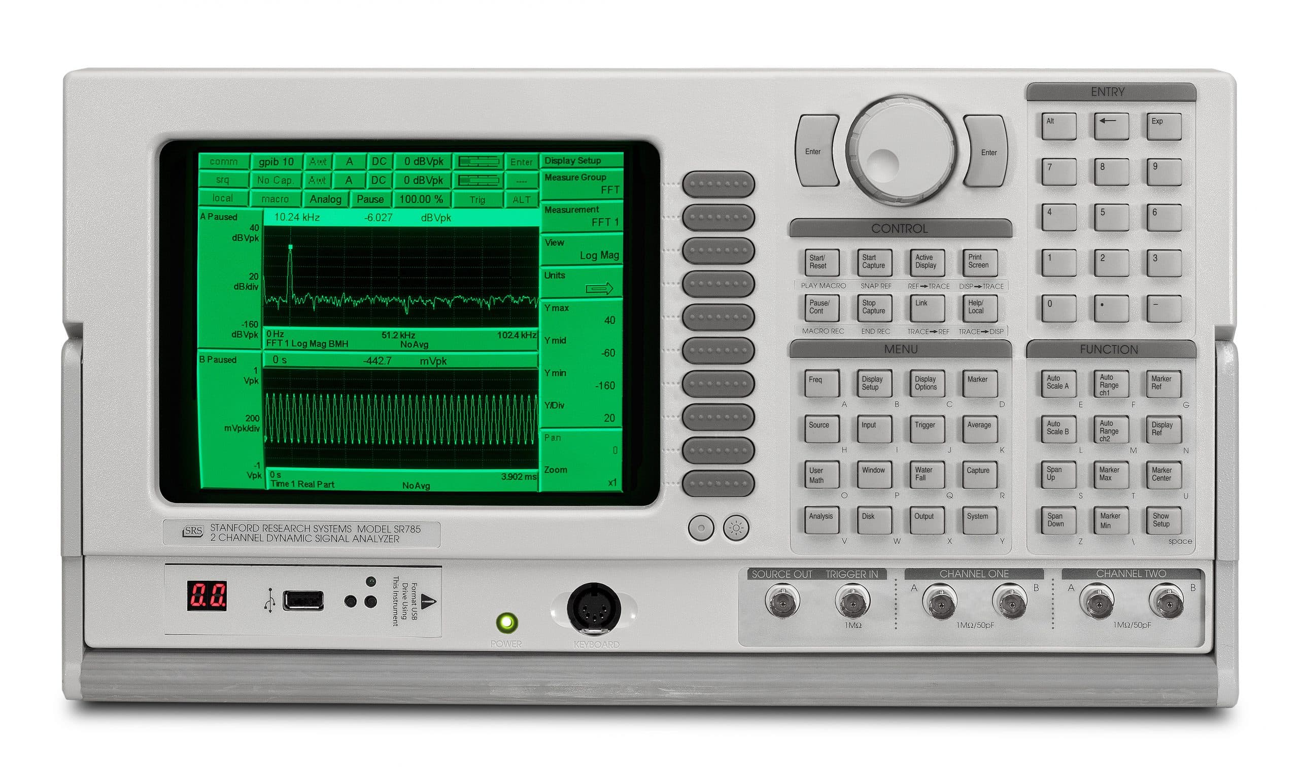 Die Anwendungsgebiete des SR785 erstrecken sich von der mechanischen Schwingungsanalyse im Maschinenbau über Strukturanalyse, Vibrations-, Audio- und Akustik-FuE bis hin zu Rauschmessungen und Filterdesign sowie vielfältigen Messungen in der Qualitätsicherung. Das Modell SR785 arbeitet von DC bis 102,4 kHz im Echtzeitbetrieb. Der Dynamikbereich von 90 dB erlaubt eine weitreichende Signalanalyse bezüglich Störfrequenzen und Rauschen. Durch den Eingangsspannungsbereich von 3 mVs bis 50 Vs können Mikrofone und andere Sensoren ohne Vorverstärker angeschlossen werden. Durch die eingebaute Signalquelle sind Bodediagramme nach Betrag und Phase, sowie Intermodulationsmessungen möglich.