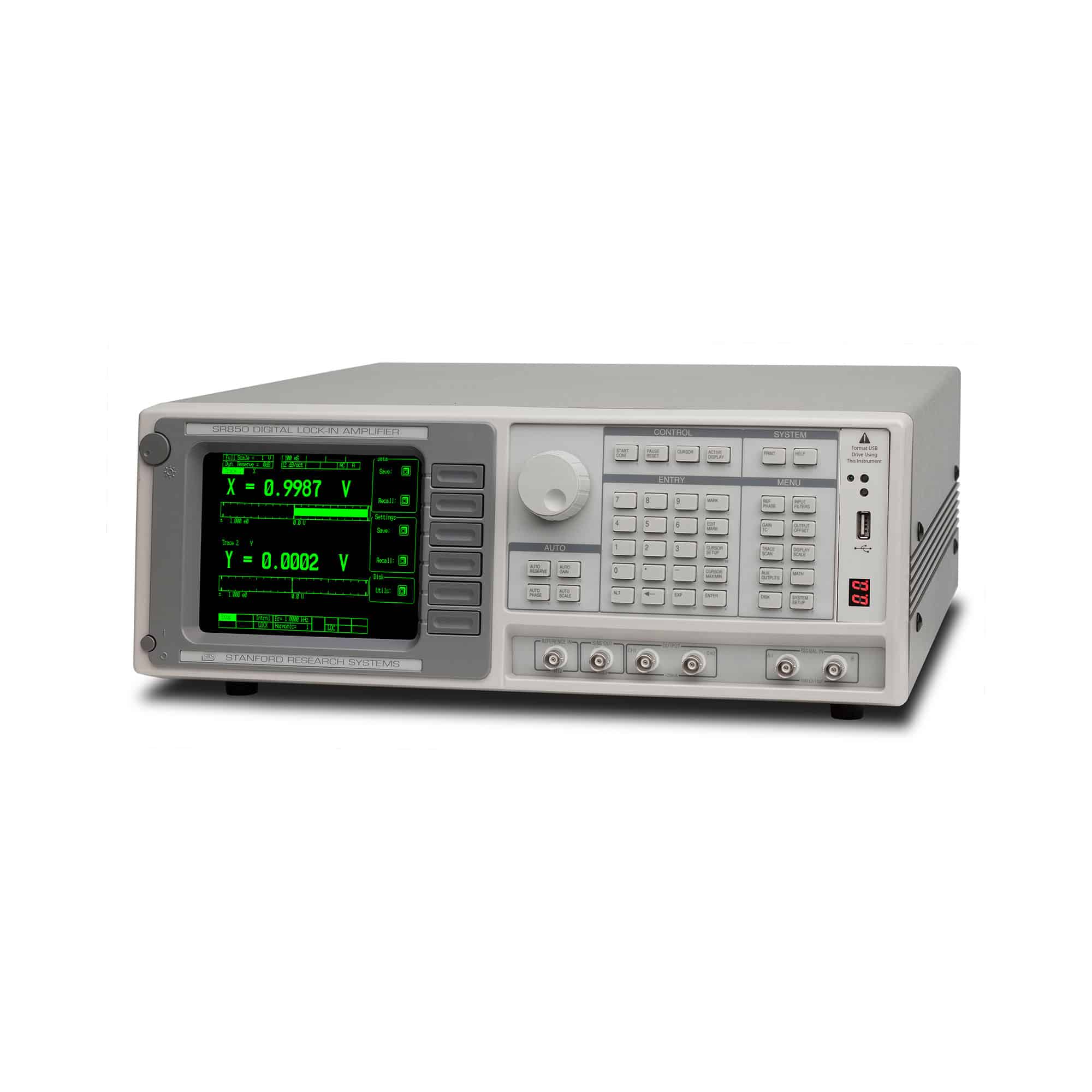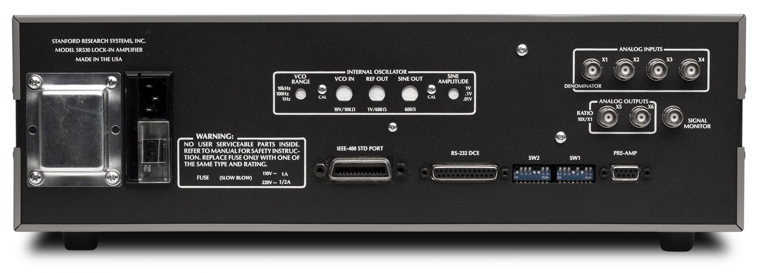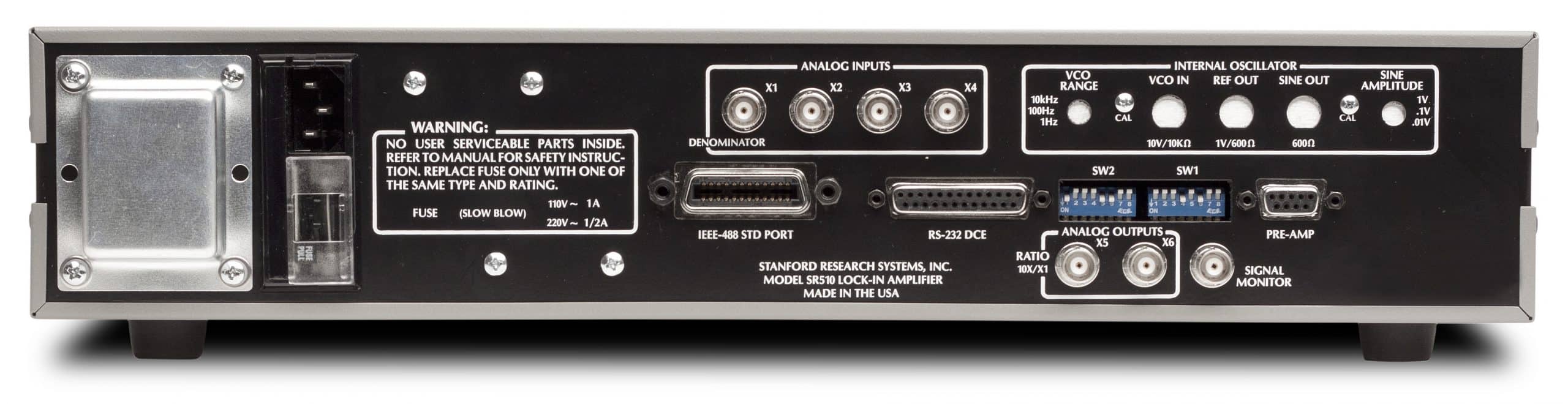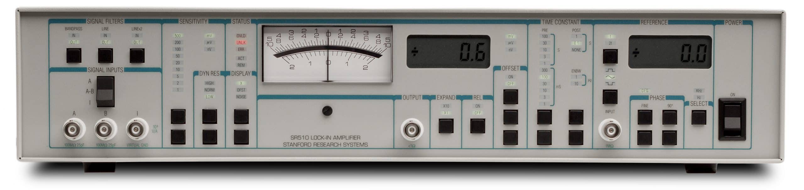 Der SR510 ist ein analoger Lock-In Verstärker, der Wechselspannungs- und Wechselstromsignale in stark störbehafteter Umgebung messen kann. Beide Verstärker besitzen rauscharme Spannungs- und Stromeingänge. Die Geräte liefern hohe Dynamikreserven, variable Zeitkonstanten und enthalten einen internen Oszillator. Zusätzlich sind die Verstärker mit vielen anwendungsspezifischen Eigenschaften ausgerüstet, die die Bedienung sehr vereinfachen. Die Messwerte werden in digitaler und analoger Form dargestellt. Serielle wie parallele Schnittstellen sind implementiert.
