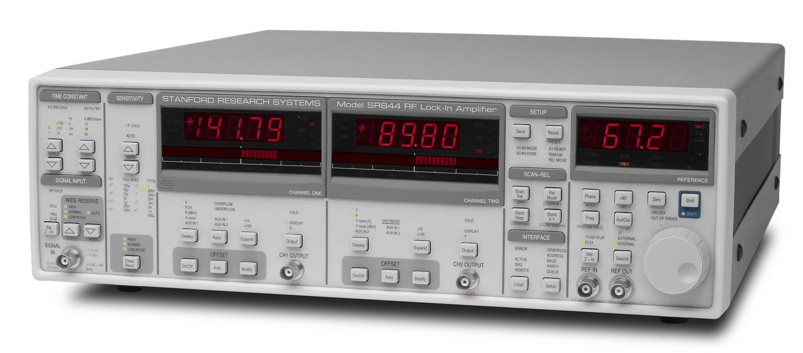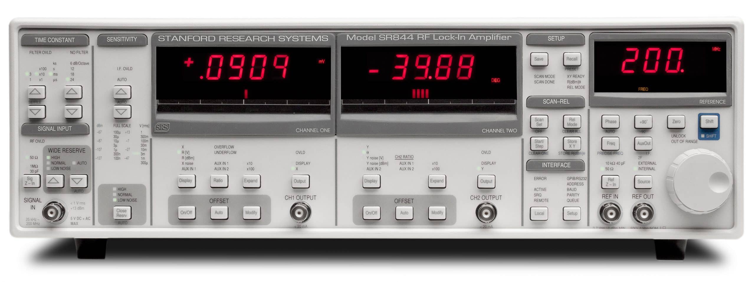 Der SR844 bietet eine gleichzeitige Anzeige von Real- und Imaginärteil, bzw. von Betrag und Phase des Messsignals. Der eingebaute Oszillator kann als Trigger oder anderweitige Anregung verwendet werden. Durch Auto-gain, -sensitivity, -offset, -ranging und -threshold wird eine komfortable Bedienung ermöglicht. Die digitale Signalverarbeitung entfernt herkömmliche Fehlerquellen wie DC-Offsets, Temperaturdriften und Verstärkungsfehler. Eingebaute digitale Filter erlauben hochgenaue Amplitudenmessungen.