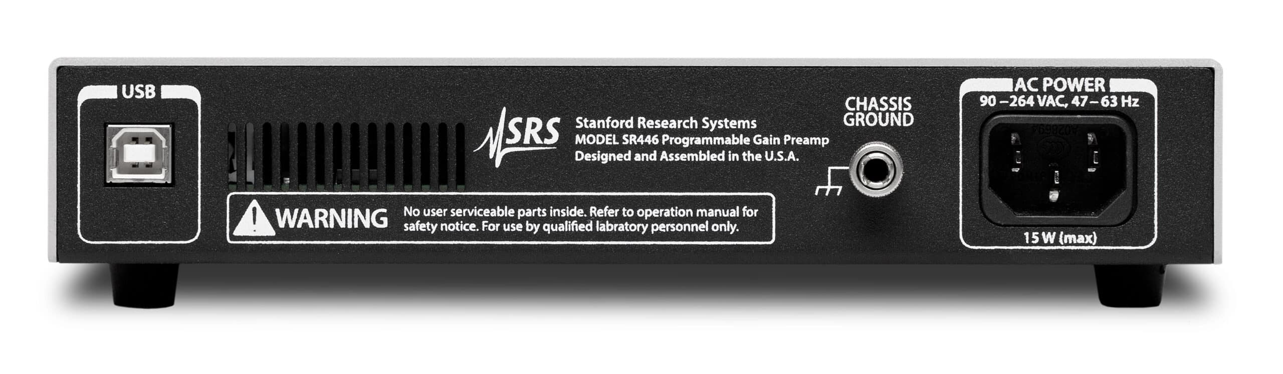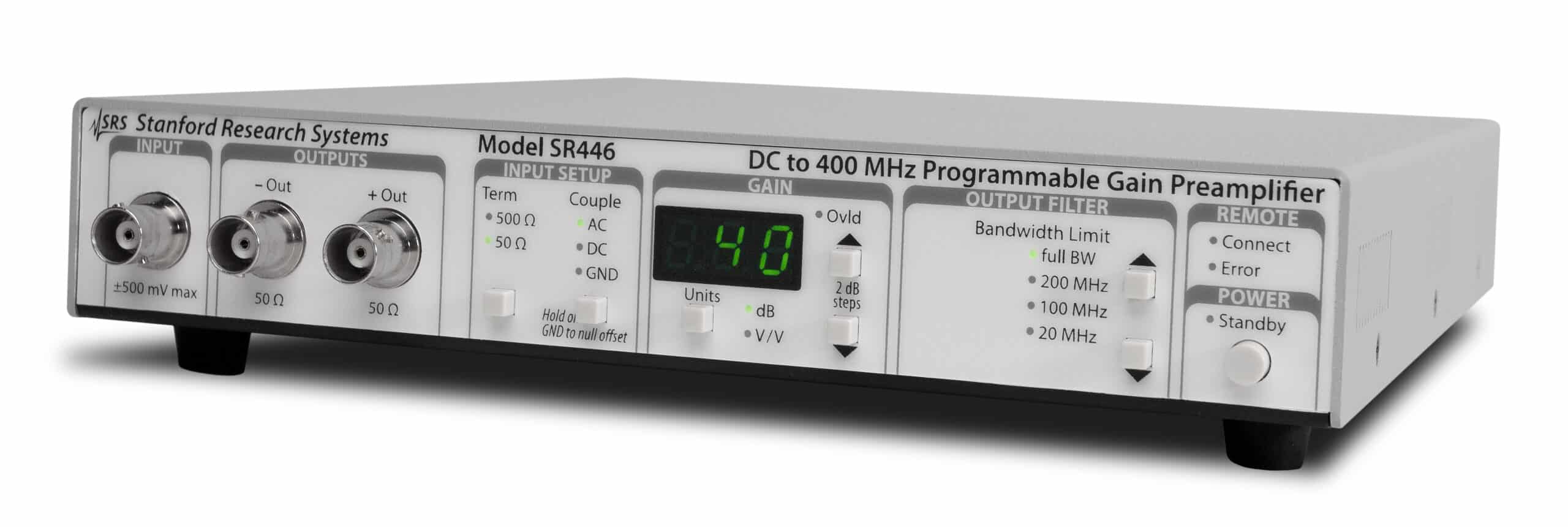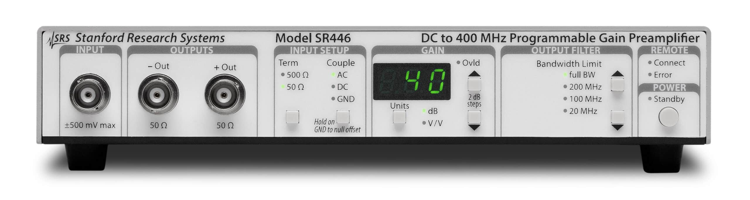 Der einkanalige Spannungsvorverstärker SR446 verfügt über 400 MHz Bandbreite und 21 programmierbare Verstärkungsfaktoren von ×1 bis ×100 (+0 dB bis +40 dB in 2-dB-Schritten). Trotz des breiten Arbeitsfrequenzbereichs ist das Eingangsrauschen außerordentlich gering mit nur 3,3 nV/√Hz. Ebenfalls integriert sind vier programmierbare Tiefpassfilter mit Einstellungsmöglichkeiten über die volle Bandbreite, 200 MHz, 100 MHz und 20 MHz. Außerdem bietet der Vorverstärker zwei komplementäre Ausgangskanäle (invertierend und nicht invertierend), die separat oder zusammen als differenzieller Ausgang verwendet werden können.