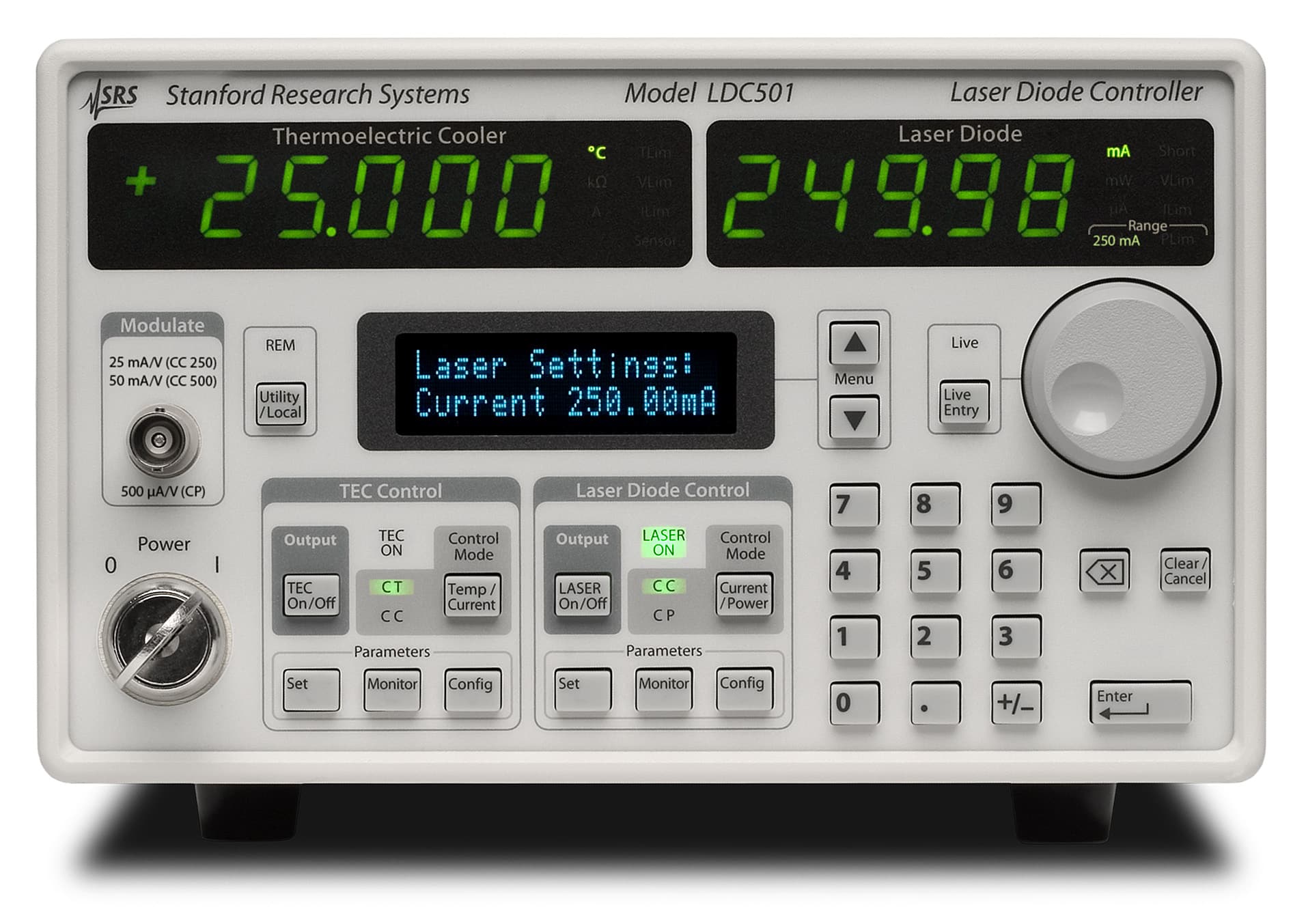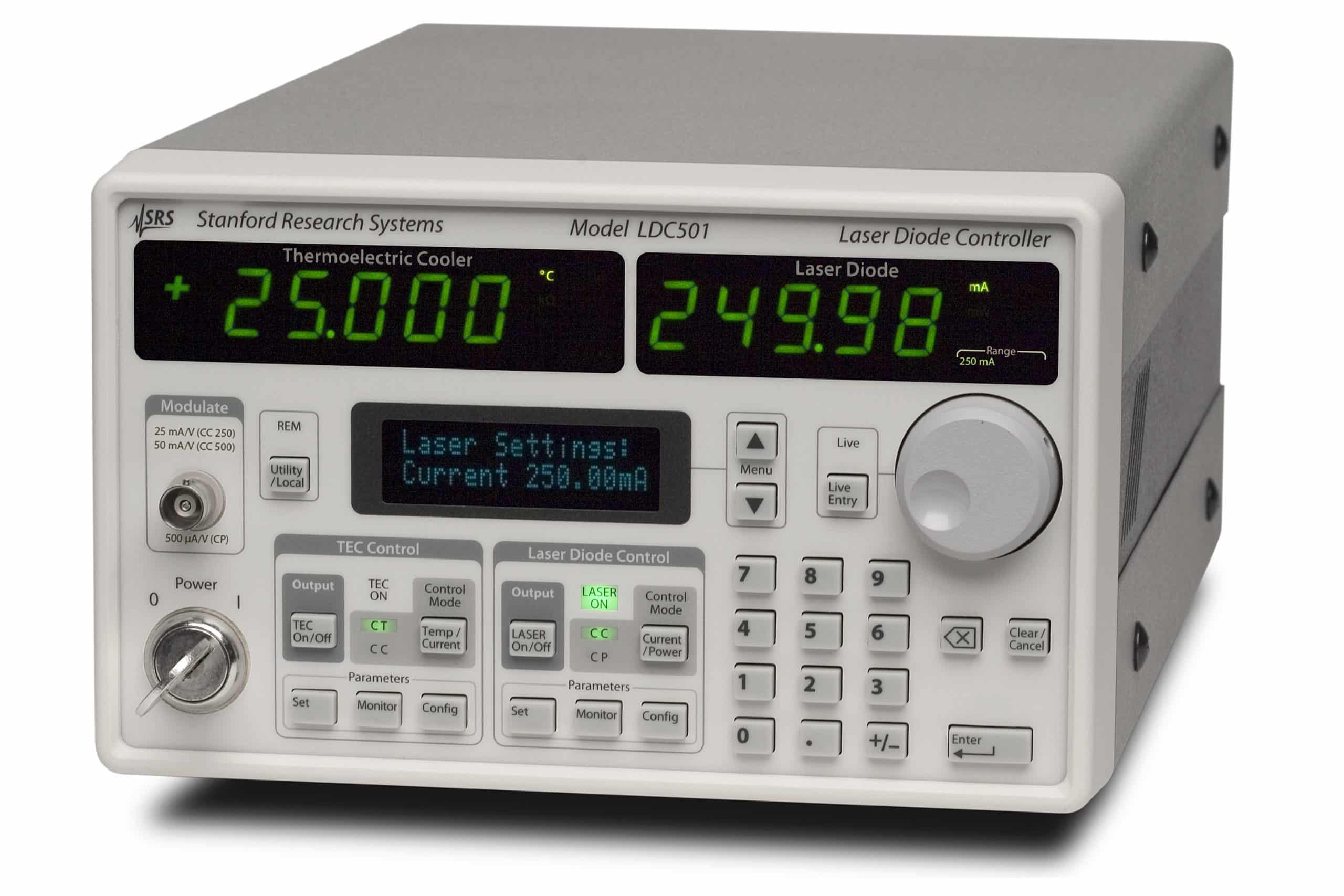 Bei der LDC500-Serie handelt es sich um Laserdioden- und Temperatur-Controller. Es sind die idealen Geräte zur Ansteuerung und Überwachung von Laserdioden und beinhalten eine hochstabile, rauscharme Stromquelle mit integriertem Temperaturregler. Dem Schutz der Laserdiode dient die Möglichkeit des langsamen Hochfahrens des Stroms sowie einstellbare Stromgrenzen. Das Gerät enthält zwei getrennte Stromversorgungen, die voneinender magnetisch abgeschirmt sind. Hierdurch wird gewährleistet, dass beide Regler durch eine sehr saubere, stabile, isolierte Stromversorgung gespeist werden. Als Temperatursensoren finden Thermistoren, RTDs und IC-Spannungs-/Stromsensoren Verwendung.