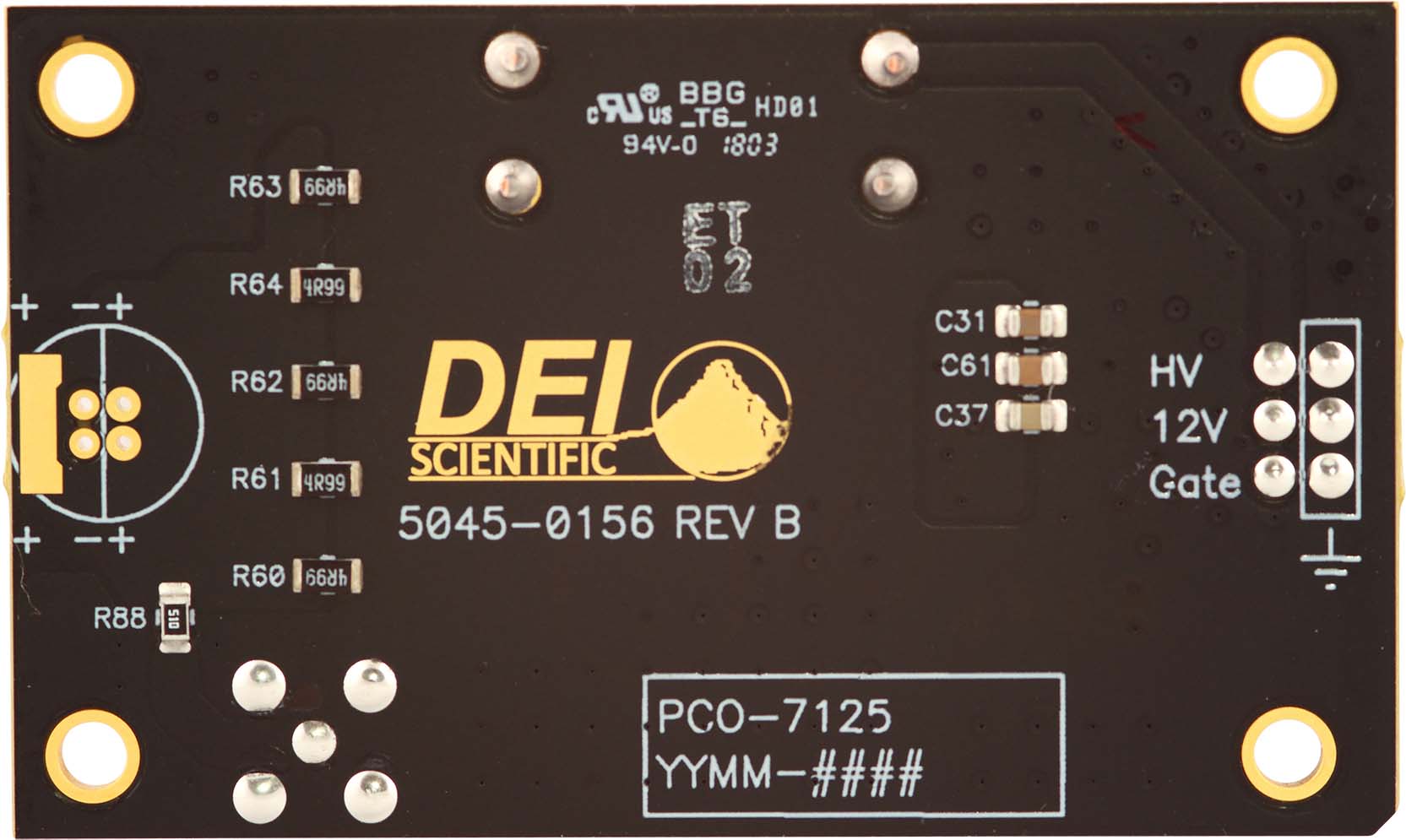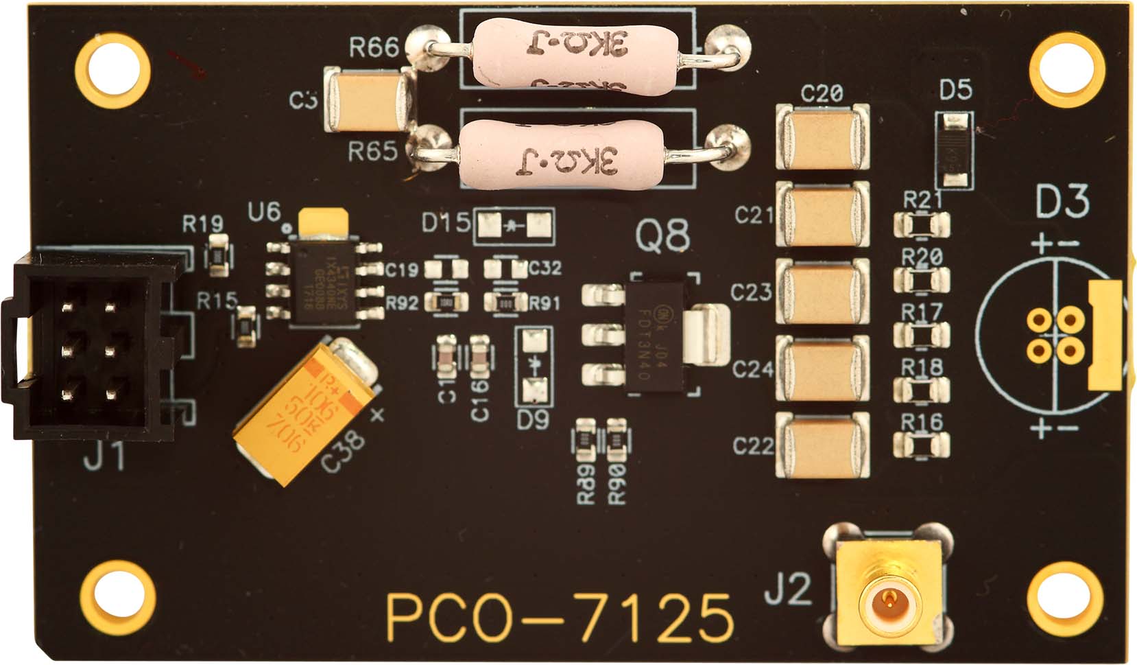 Die DC-Hochspannungs- und +12-VDC-Stromversorgungen werden über J1, einen sechspoligen Stecker, mit Hilfe des mitgelieferten Steuerkabels angeschlossen. Der Impulsstrom wird durch die HV-Versorgungsspannung im Bereich von 0 V bis +200 V (maximal) bestimmt. Über J1 werden dem Gate-Eingang außerdem extern erzeugte Pulse zugeführt. Die Breite und Wiederholungsrate der Gate-Impulse legen direkt das Timing der Ausgangsimpulse fest.