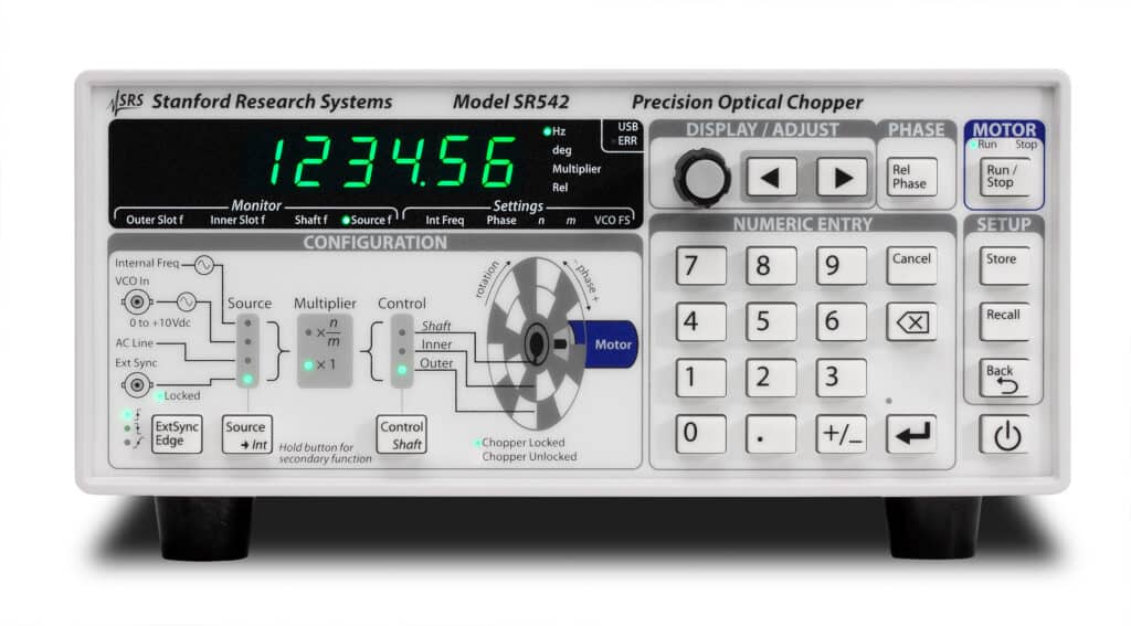 Der SR542 Precision Optical Chopper (optischer Lichtzerhacker) bietet ultrastabiles und flexibles optisches Chopping. Die Chopper-Frequenz ist beim Nachfolger des SR540 über einen weiten Bereich einstellbar und Frequenz sowie Phase können von einer Vielzahl von Eingangsquellen gesteuert werden, einschließlich der Synchronisation mit einer externen Referenz. Das Frontpanel bietet eine intuitive Bedienoberfläche zeigt dem Anwender die gesamte Konfiguration auf einen Blick. Zusätzlich ermöglicht die USB-Schnittstelle die vollständige Steuerung von einem Remote-PC aus.